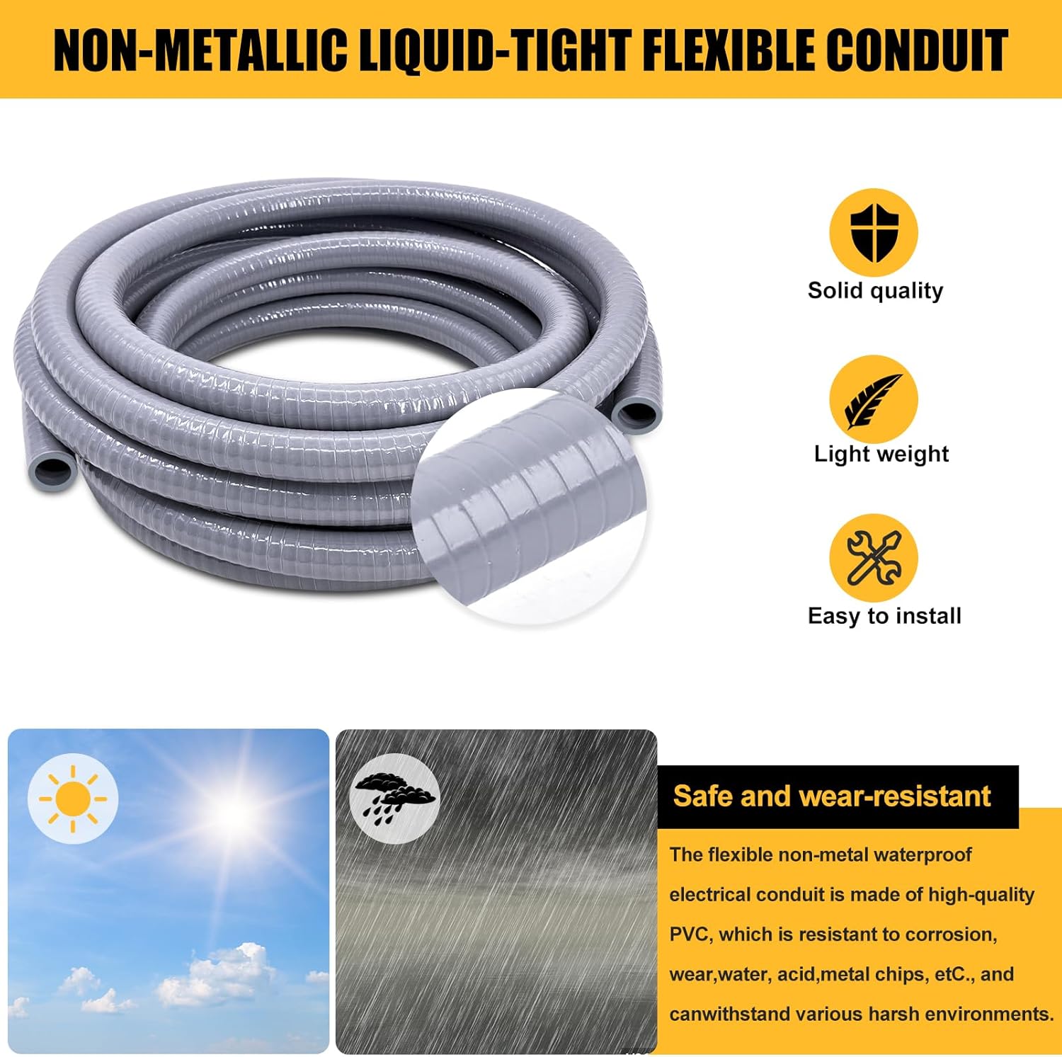 Premium Liquid-Tight Conduit made of high-quality anti-oxidation pvc, which has very good corrosion resistance, wear resistance, oil resistance, water resistance and acid resistance, and can be used normally even in harsh environments. Complete Accessories 1-1/2-Inch 50 Foot Flexible Electrical Conduit with 5 180 Degree Straight and 4 90-Degree Conduit Connector Fittings, with 10 Pipe Strap. Easy to Install No disassembly is required, simplifying the installation of wires.The installer Only needs to push the conduit or pipe onto the ferrule to tighten the dome sealing nut;Easy to cut to the length you need with a utility knife or PVC cutter. Applications Because it has very good durable, pulling and squeezing; Widely used in HVAC equipment, machine tools, marine equipment, motors and controls, printing equipment, pumps, refrigeration equipment, transformer connections, outdoor lighting. Warm Tip Our products are equipped with accessories: including 180 Degree straight and 90 Degree angle accessories. When you encounter a product you receive that is missing Connector accessories, please contact our customer service as soon as possible to solve your problem. We will provide you with a solution that satisfies you!