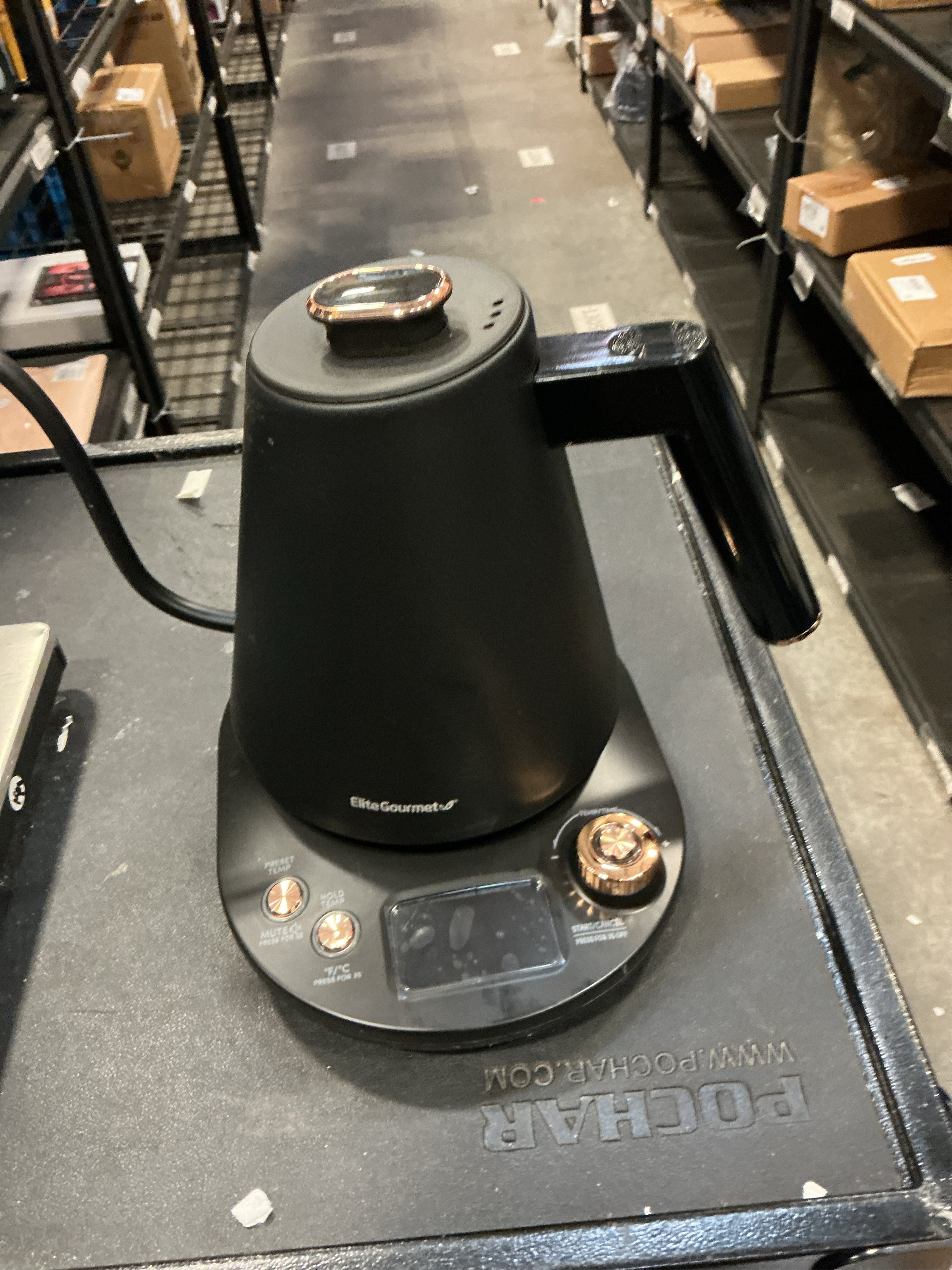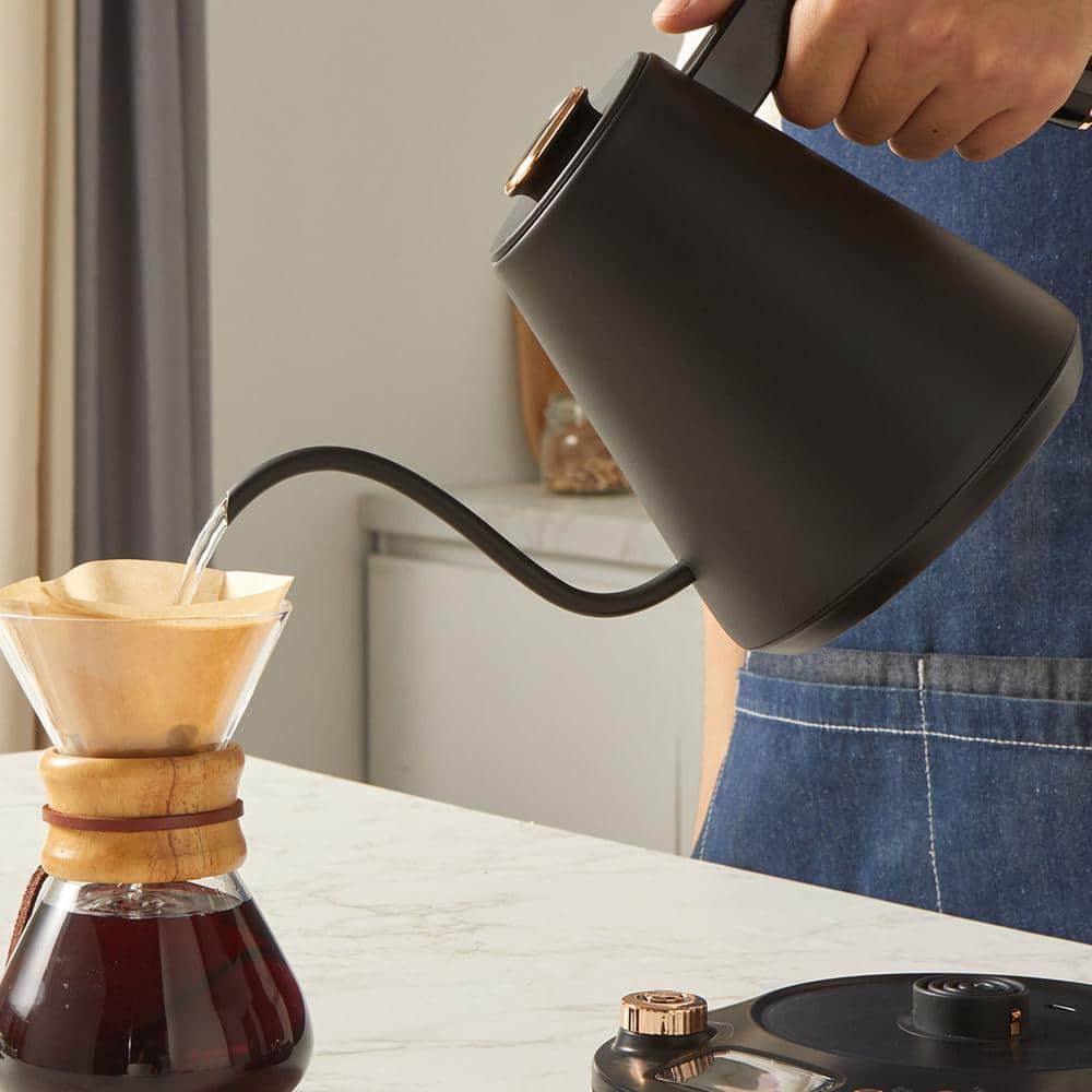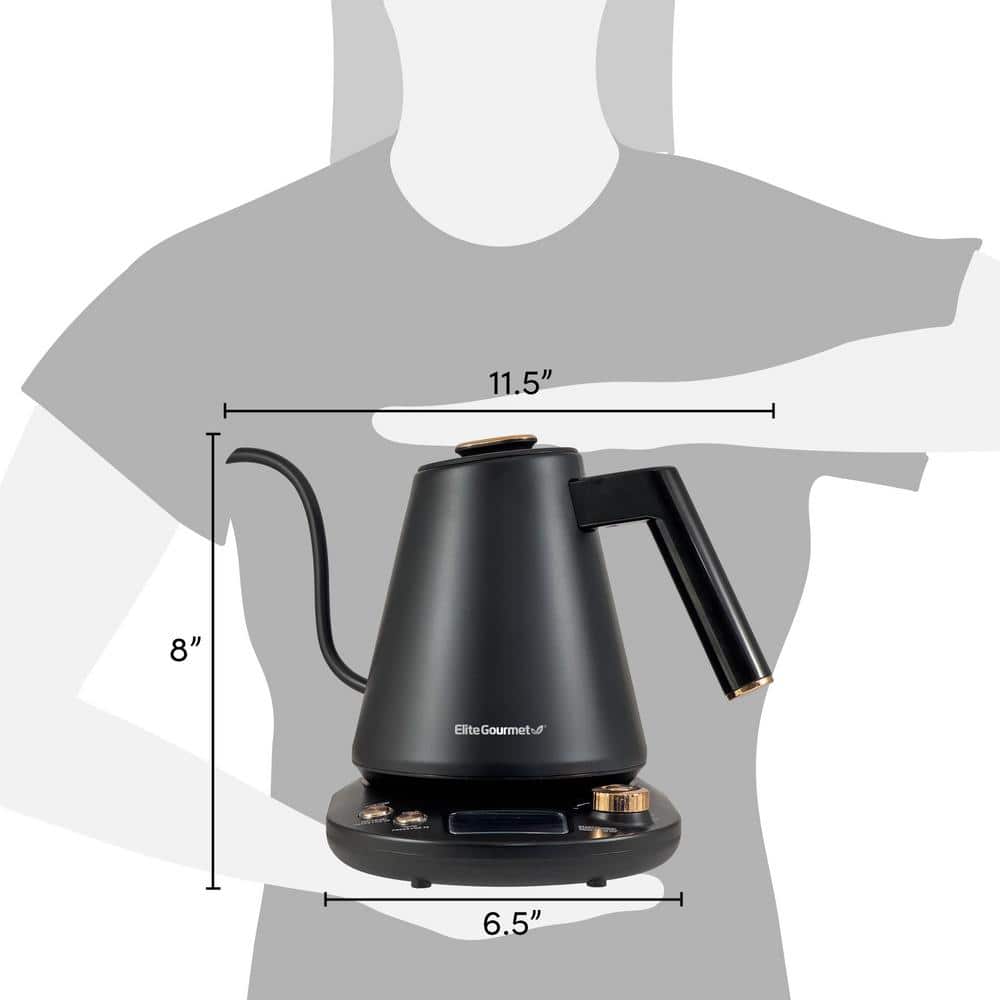 Elite Gourmet 1L Digital Gooseneck Water Kettle is the best way to prepare hot water for pour-over coffee, tea and foods that require adding hot water such as instant hot cocoa, oatmeal or noodles and other soups. Simply select 1- of the pre-programmed temperatures or adjust to your desired temperature, press Start and you'll have hot water ready in minutes. Once the desired temperature or a boil is achieved, the kettle automatically shuts off or enters Keep Warm program (if selected). There's no need to worry or hover over a kettle or pot on the stove. Safety is paramount, so your kettle is equipped with boil-dry protection and auto-shutoff. If it starts heating and detects the absence of water in the unit, the kettle will automatically shut off to avoid damaging the heating element.. Appliance Type: Coffee Maker. Capacity (L): 1. Capacity (fl. oz.): 33. Color/Finish: Black. Color/Finish Family: Black. Features: No Additional Features. Includes: No Additional Items. Number of Cups: 6. Product Weight (lb.): 2.73 lb. Returnable: 90-Day. Small Appliances Color Family: Black. Small Electric Product Type: Electric Kettle. Wattage (W): 1200 W. Certifications and Listings: No Certifications or Listings. Safety Listing: No Safety Listings. Product Depth (in.): 12 in. Product Height (in.): 8 in. Product Width (in.): 8 in. Capacity (L): 1. Capacity (fl. oz.): 33. Number of Cups: 6