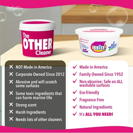ULTIMATE ALL-PURPOSE CLEANER – Quick ’n Brite replaces multiple household cleaners, tackling tough stains, grease, and grime on carpets, ovens, BBQs, kitchens, shoes, and more. SAFE & ENVIRONMENTALLY FRIENDLY – Free from harmful chemicals, Quick ’n Brite is PET-SAFE, KID-SAFE, and doesn’t contain phosphates, scratch-causing abrasives, or harsh irritants. TOUGH ON STAINS, GENTLE ON SURFACES – Made from natural ingredients, our cleaner works fast and effectively without scratching or damaging surfaces. EASY TO USE – Follow simple instructions to clean nearly anything: stovetops, showers, shoes, bathtubs, countertops, and more. TRUSTED FOR OVER 70 YEARS – Proudly made in the USA by a family-owned company committed to safe, effective, and biodegradable cleaning solutions.