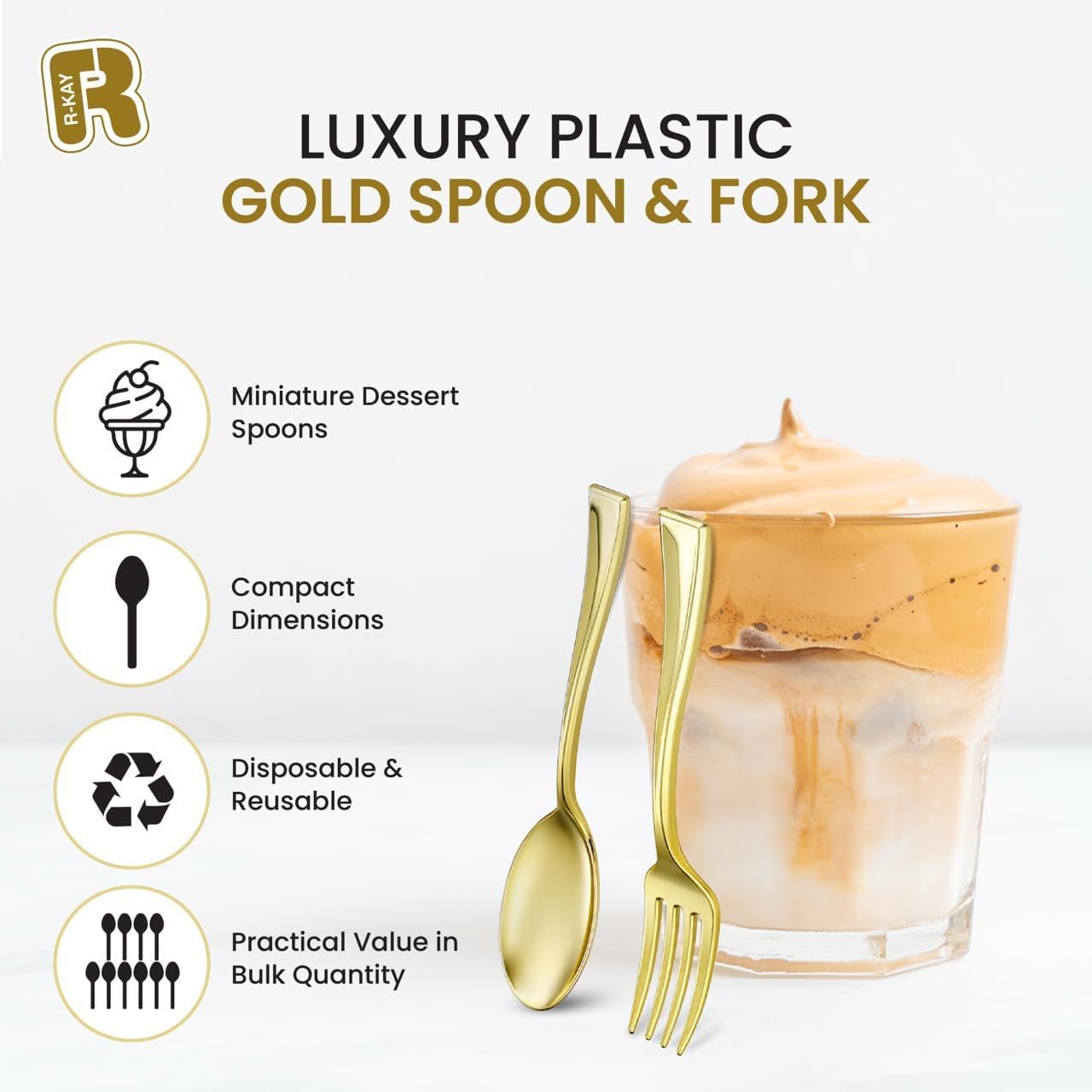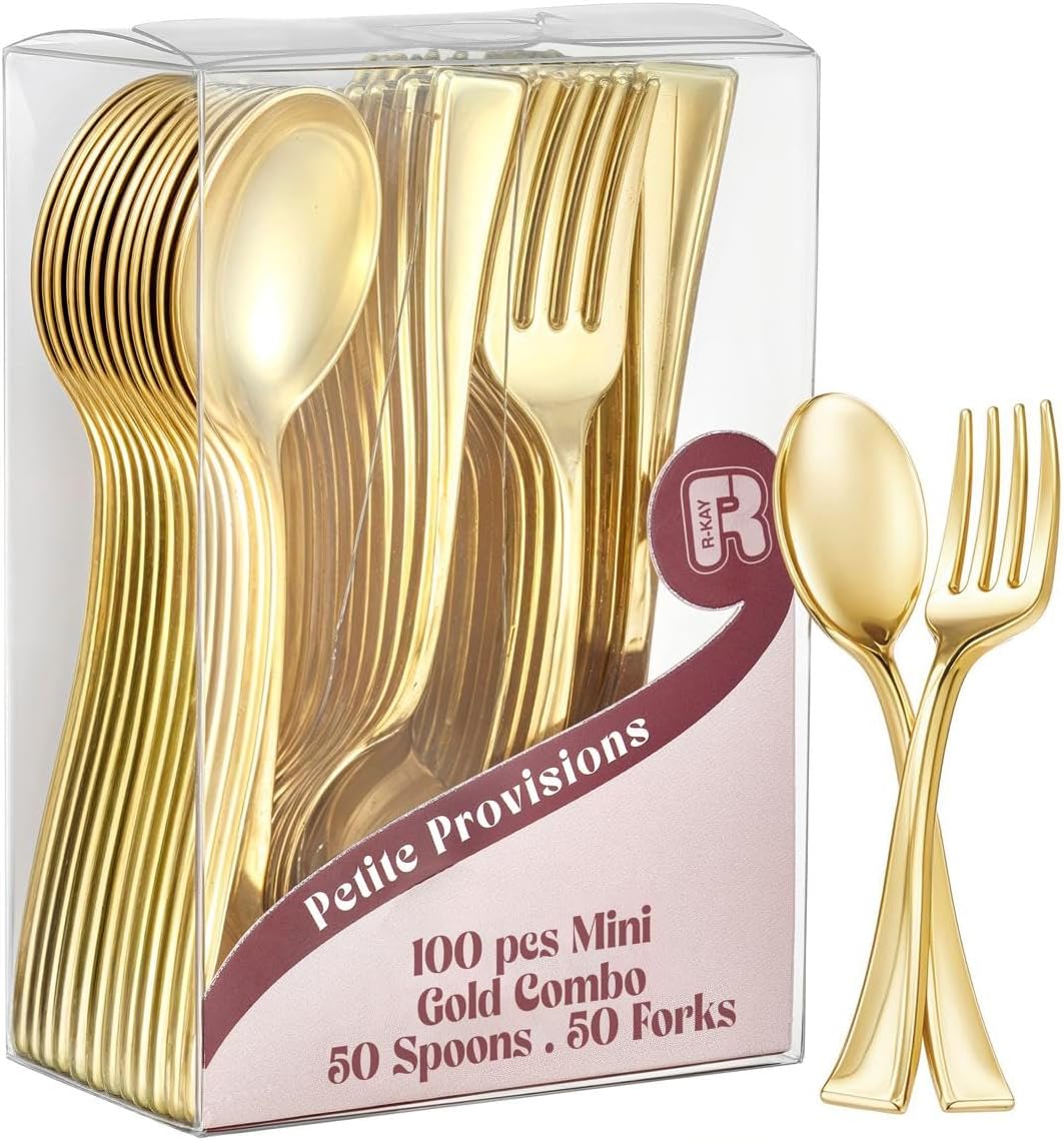 GREAT VALUE: Our 100 pack disposable mini spoons and forks ensures convenience, perfect for gatherings or daily use. Never run out of heavy duty mini gold forks and spoons stay prepared to serve with ease. Enjoy flexibility and style with this convenient supply.