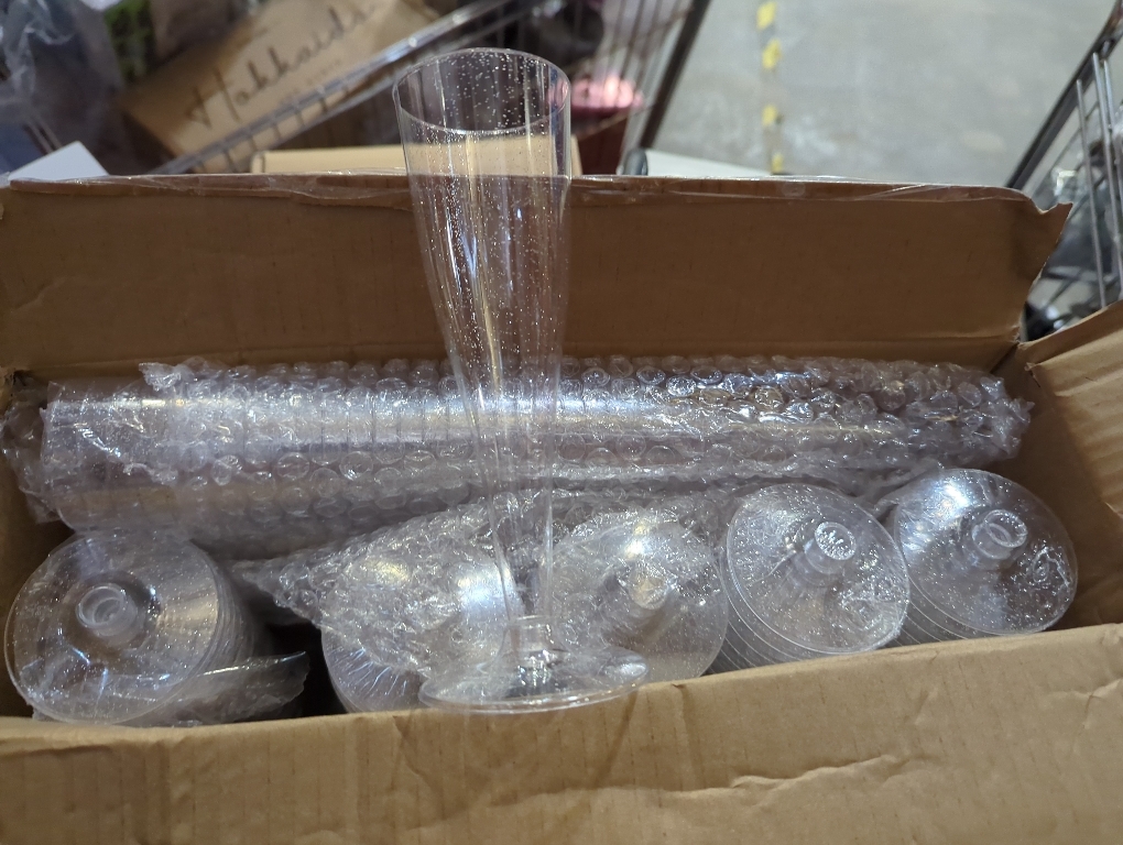 Attention: These disposable plastic champagne flutes arrive in two parts, the flute and the stand; simply pop the bottom of the flute into the stand; please note, this bulk set of 100 champagne flutes plastic are not for microwave or dishwasher use