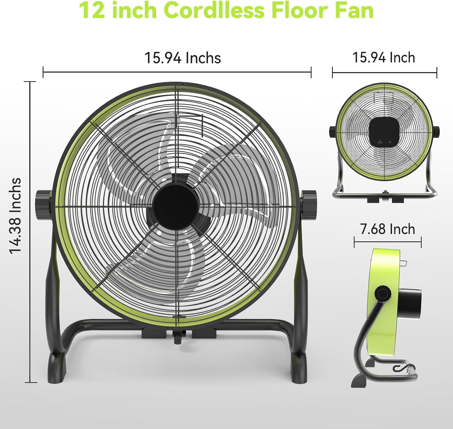 12 Inch Battery Operated Fan, Portable Rechargeable Cordless Fan High Velocity Heavy Duty Metal Floor Fan for Camping Hurricane Home Warehouse