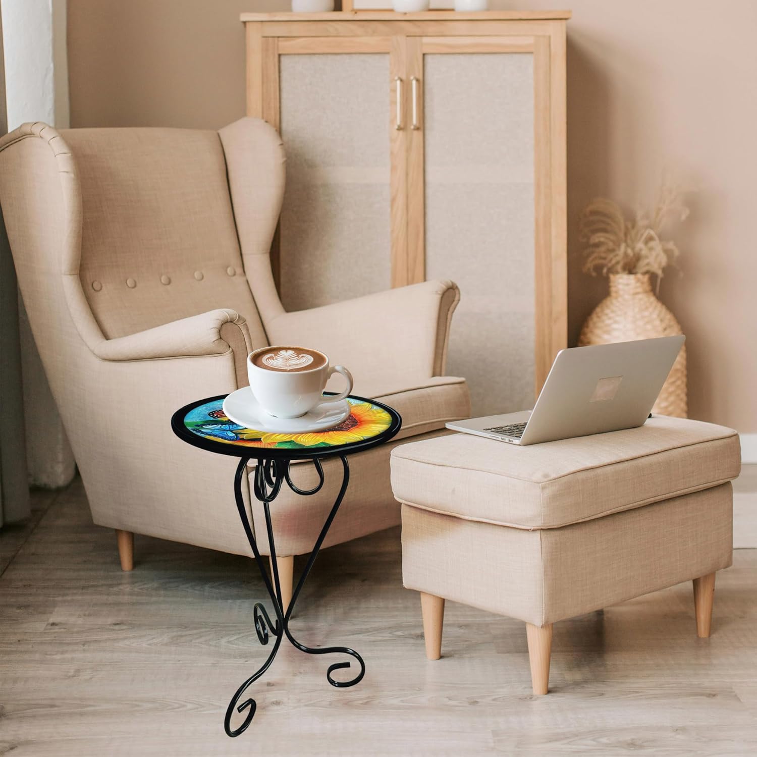 12 Inch Outdoor Side Table, Round Patio Accent Indoor End Table with Glass Top & Metal Base for Living Room, Office, Balcony, Sunflower Butterfly Indoor Furniture Decor(20" Height)