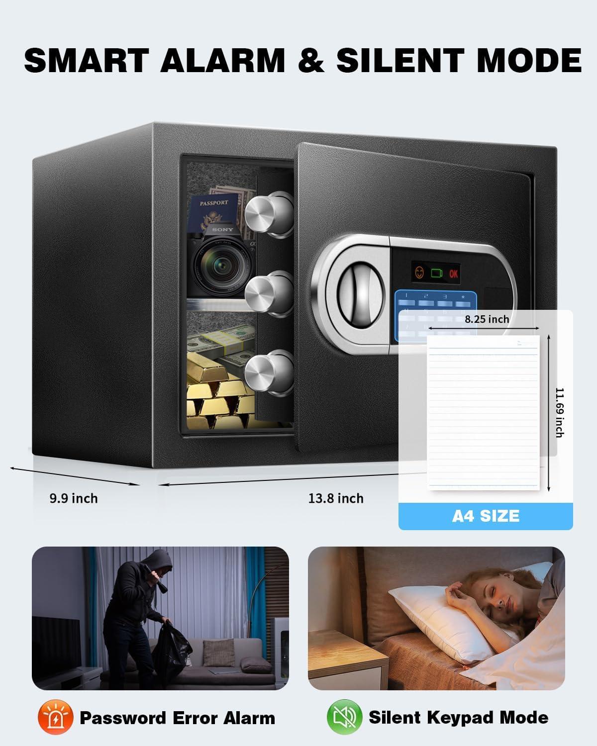 【Smart LED Light & Keyboard Silent Mode 】①The interior LED light improves visibility so you can easily access your valuables in the dark. Also, the home safety box’s indicator light will remind you that the battery is about to run out by lighting up a red light. ②Optional silent mode, Press and hold *, then press 633/66 to freely turn on/off silent mode, protecting your family's sleep from being disturbed.