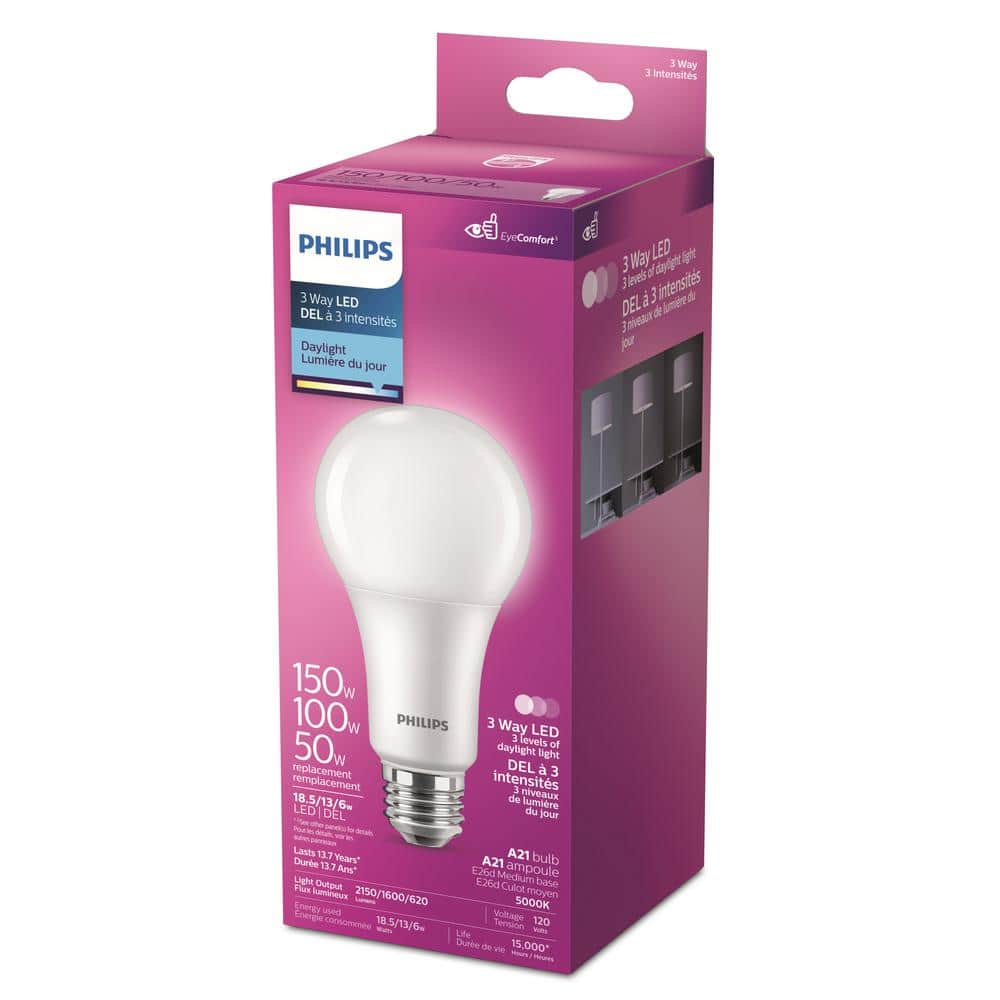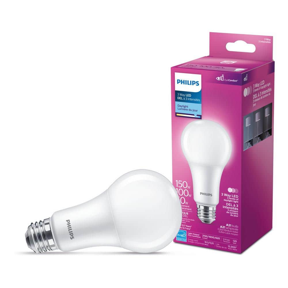 The Philips 150/100/50W equivalent A21 LED bulb is specifically designed to light your home with a flicker-free experience with Eye Comfort. Enjoy comfortable light with familiar shapes you know and love. These plastic LED bulbs use significantly less energy than traditional incandescent light bulbs. This bulb has a medium (E26) base.. Average Life (hours): 15000. Bulb Color: White. Bulb Finish: Frosted. Bulb Material: Plastic. Bulb Shape: A-Style. Color Rendering Index (CRI): 90. Color Temperature: Daylight (5000K). Control Type: Switch. Dimmable Capability: Non Dimmable. Indoor/Outdoor: Indoor. Light Bulb Base Code: E26. Light Bulb Base Type: Medium. Light Bulb Features: 3-way,Energy Saving. Light Bulb Shape Code: A21. Lighting Technology: LED. Lumens: 2150. Max. Operating Temperature (F): 113 °F. Number of Bulbs Included: 1. Rated: Damp Rated. Returnable: 90-Day. Volt (v): 120. Wattage (Watts): 18.5. Wattage Equivalance: 150. Certifications and Listings: UL Listed. Product Diameter (in.): 2.78 in. Product Height (in.): 5.24 in. Number of Bulbs Included: 1. Light Bulb Shape Code: A21. Color Temperature: Daylight (5000K). Bulb Shape: A-Style. Indoor/Outdoor: Indoor. Bulb Color: White. Light Bulb Base Code: E26. Dimmable Capability: Non Dimmable