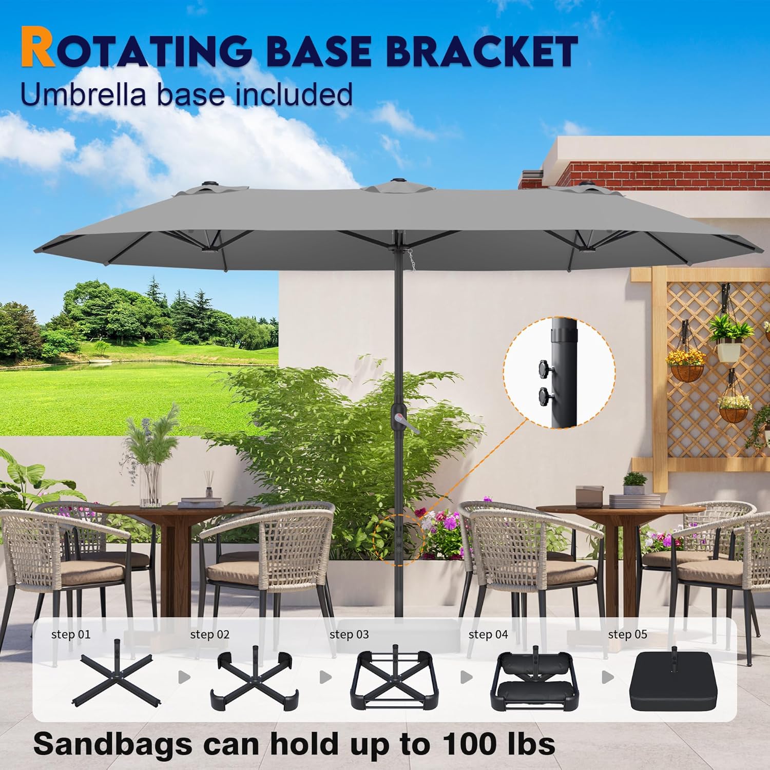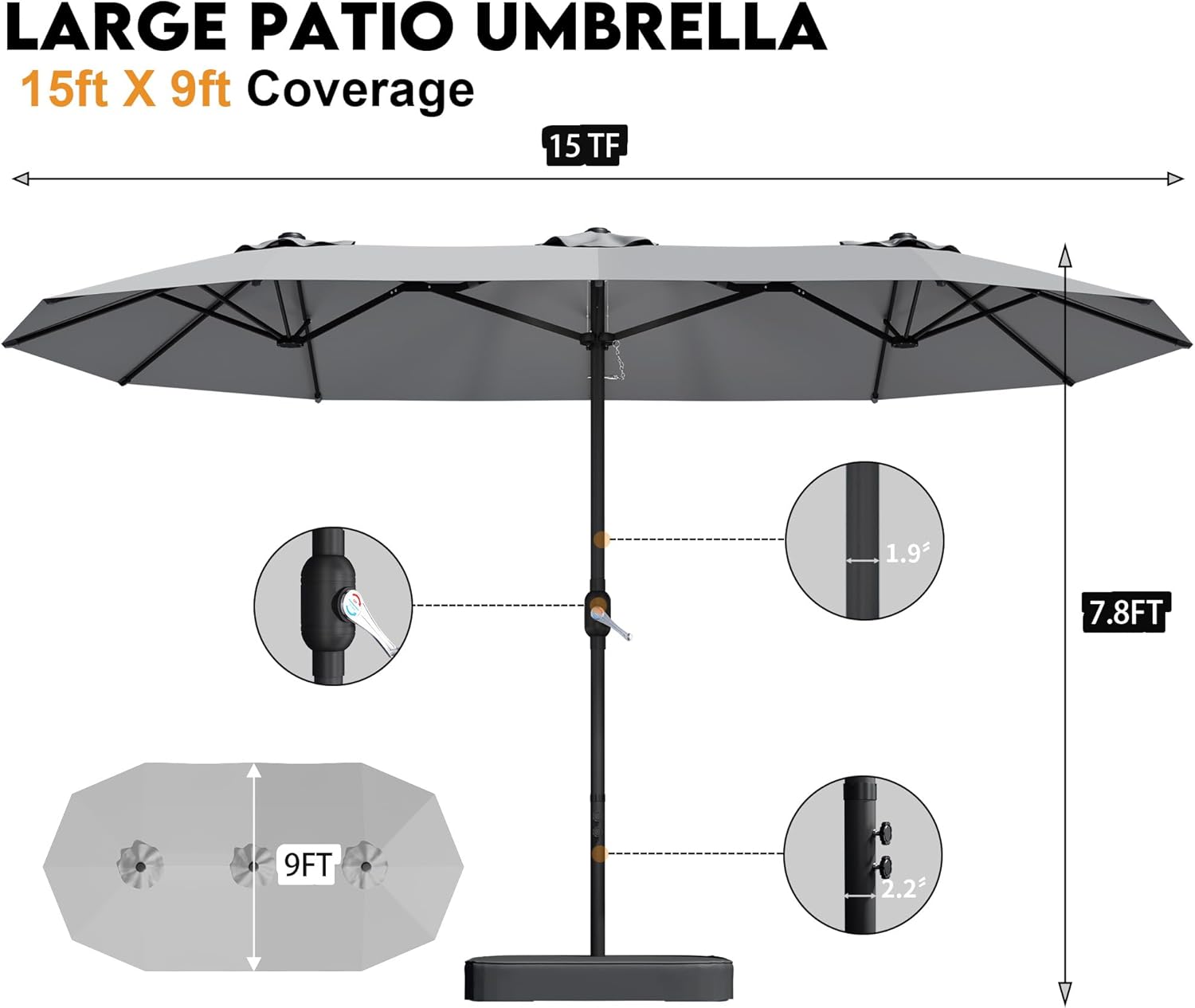 Double-Sided Umbrella: The 15ft x 9ft DomeShade umbrella provides a wide shading area, offering maximum flexibility whether you're relaxing by the pool or hosting an outdoor event. Robust & Durable Frame: Built with a powder-coated steel pole and 12 rust-proof steel ribs, this large patio umbrella is designed for superior strength and long-lasting outdoor use. The umbrella base set includes 2 sandbags (to be filled with sand before use), providing additional stability for the umbrella. Premium 100% Polyester Canopy: Crafted from high-quality 100% polyester fabric, this double-sided patio umbrella is waterproof, UV-resistant, breathable, and fade-resistant. Stay cool and comfortable outdoors, no matter the weather, with fabric designed for durability and long-lasting use. Effortless Crank Mechanism: Featuring a user-friendly crank lift system, this patio umbrella allows for smooth and easy opening and closing—no hassle, just simple operation for everyday convenience.