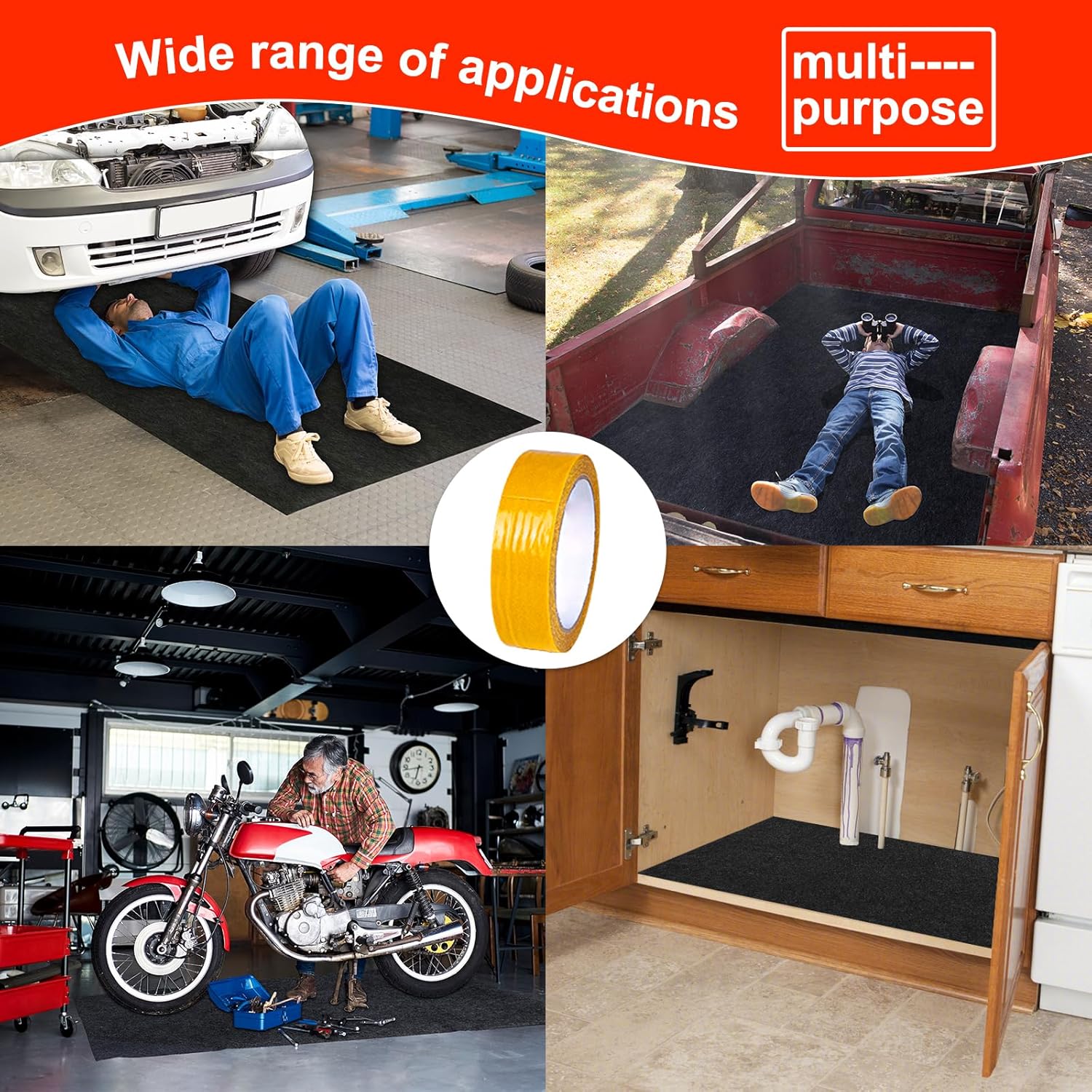 Waterproof and Absorbent Design:The waterproof layer stops motor oil, brake fluid, gasoline, coolant, and prevents these liquids from soaking through to damage or stain the surface below. The Double Sided Tape helps keep the mat in place