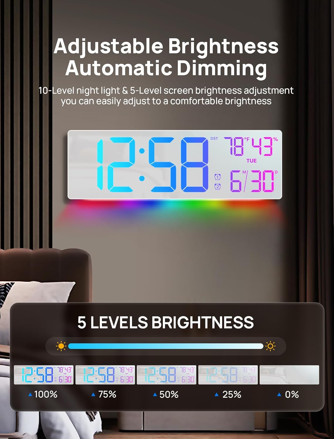 9 Dynamic RGB Color Selection: The large digital clock offers 9 display colors, including 5 dynamic RGB color and 4 regular color. Use the remote to switch clock face colors easily, enabling single or multi-color modes to match your preference or space. Adjust display brightness in 5 levels via remote. Built-in auto-dimming sensor adapts to ambient light—bright for clear daytime visibility, dim for a peaceful nighttime sleep environment