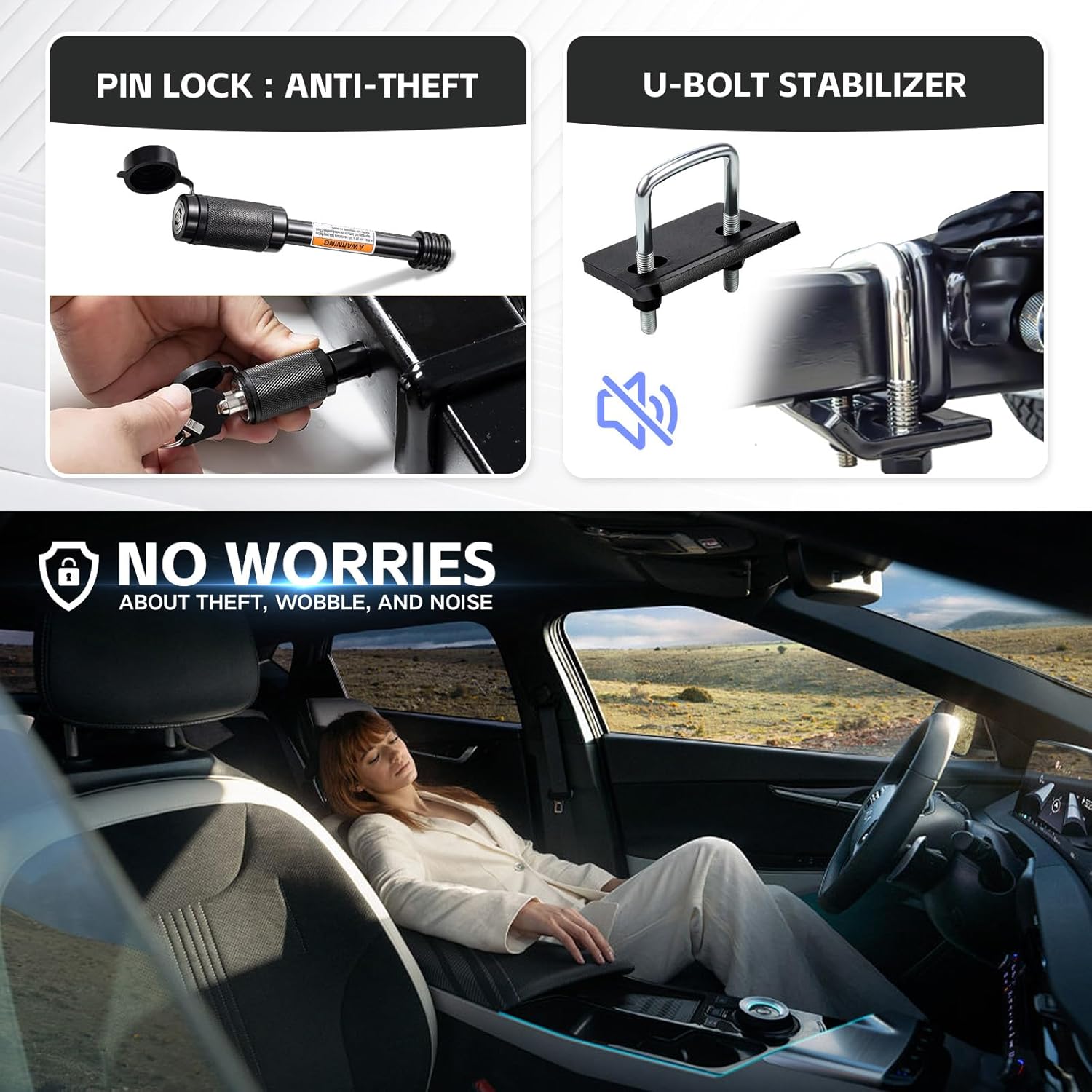 【Noise Reduction, and Anti-Sway Design】: The SUORTO EBike Rack features U-shaped stabilizers to eliminate rattling noise during travel and includes anti-sway mechanisms to prevent excessive movement, keeping your bikes stable and secure throughout your journey.