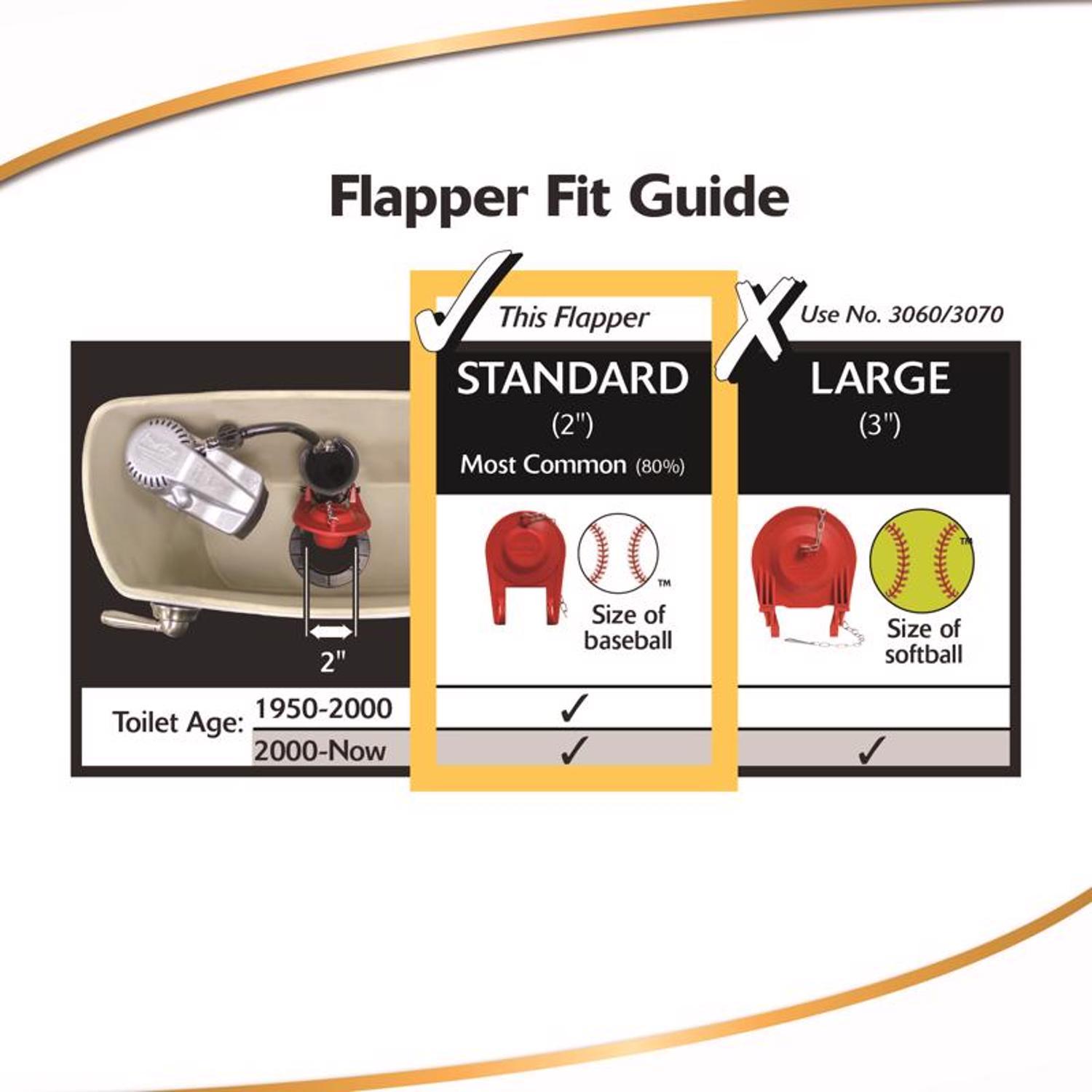 The Korky Ultra High Performance Flapper is the most universal standard 2 inch flapper available. The flapper adjusts to match original toilet settings and eliminates water waste by decreasing the amount of water flushed. Ideal for all standard 2 inch toilets, including: 1.28, 1.6, 3.5 and 5 gallons per flush gpf. The exclusive longest lasting red rubber resists chlorine, bacteria, city water treatment, hard water, and well water. Recommended by the Clorox help line, this Korky flapper is proven longest lasting. The adjustable flapper has multiple settings to ensure it fits popular standard 2 inch toilet models: American Standard Cadet 4029, 4078, 4083, 4053, 4650, Monarch 4003, Mainstream 4061, Evolution 2 Flowise 4061, Kohler Wellworth K-4620, Wellworth K-4519, and TOTO 706. Made of flexible rubber for a tight seal and easy to install.