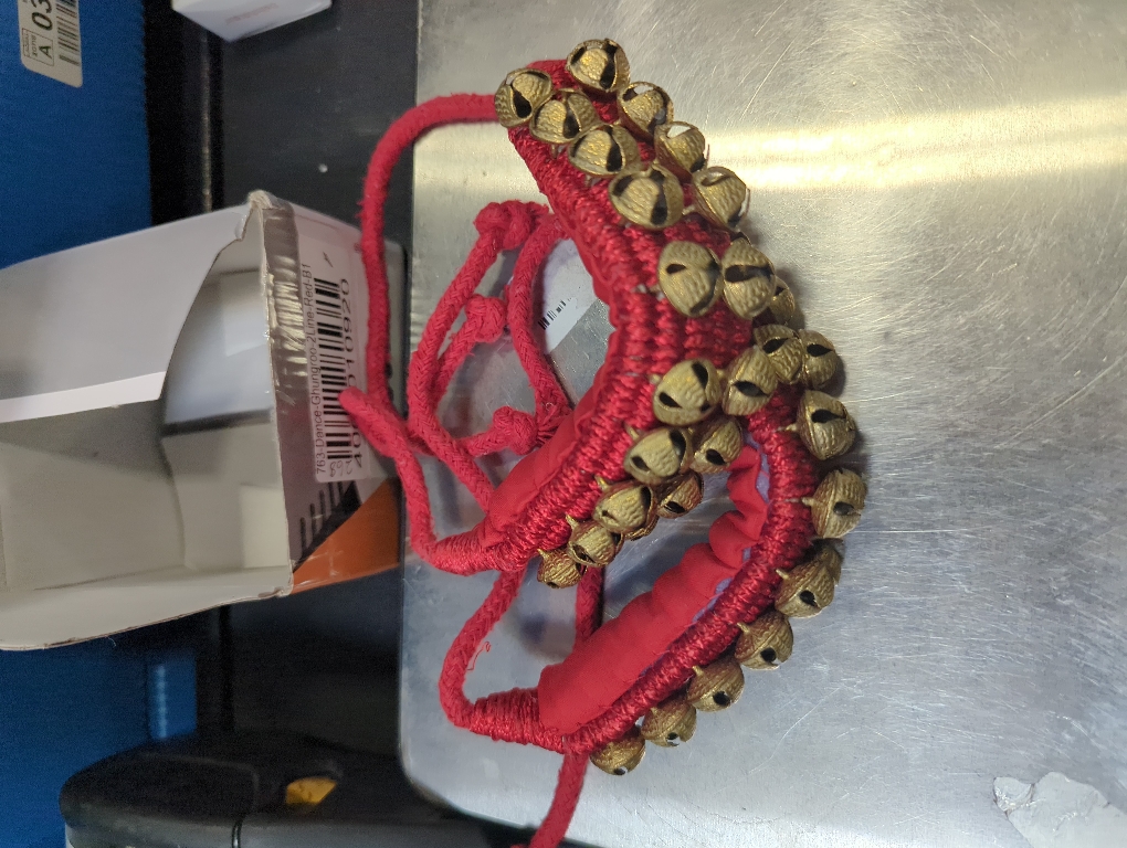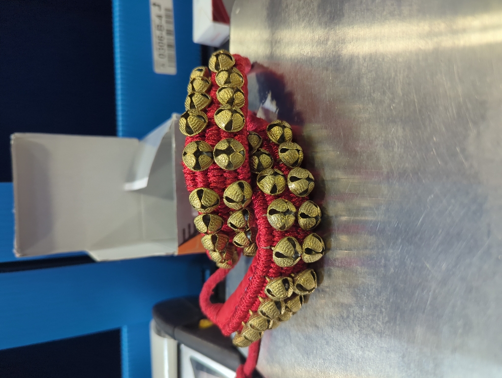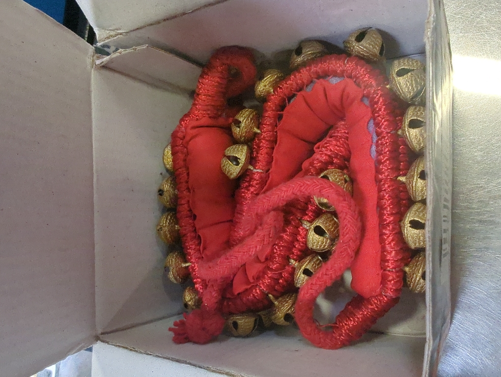 Bells of brass tied with cotton cloth. The Ghungroo are sewed/ stitched to the fabric.