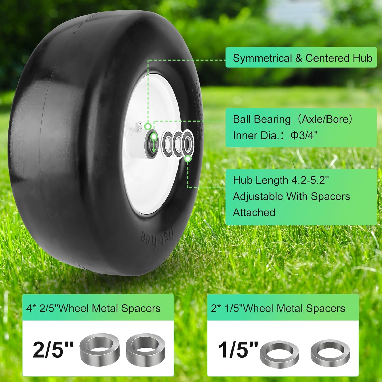 13x5.00-6 Flat Free Tire and Wheel: 13x5.00-6 Lawn mower tire is made of solid polyurethane foam, 13x5.00-6 flat free tire are resistant to punctures, thorns, and sharp objects commonly found in lawns. This eliminates the risk of tire damage and the need for frequent tire replacements. The solid construction of these tires eliminates the need for air-filled chambers, reducing vibrations and providing a more comfortable experience for the operator. Maximum weight capacity 500 lbs.