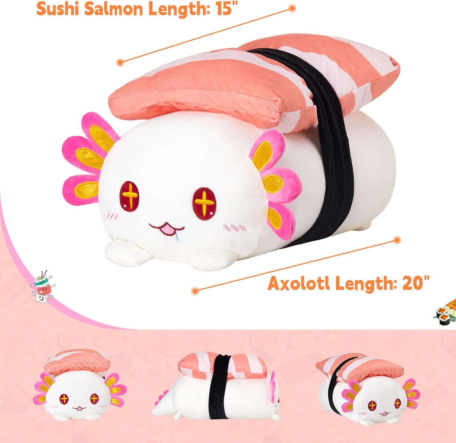 Cute Stuffed Axolotl: This cuddle axolotl plush pillow brings axolotl with Sushi, it is designed to be quite cute with two cute ears, kawaii expression, and a well-embroidered Holding Salmon action. Whether as a cuddly companion during solitary moments or a great travel accessory.