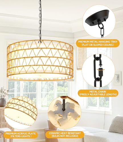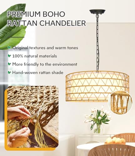 20" Rattan Chandelier Farmhouse Light Fixtures, 5-Light Boho Chandeliers for Dining Room, Fabric Lamp Shade for Living Room, Bedroom, Hallway Rattan Pendant Light Fixture, E26 (no test)