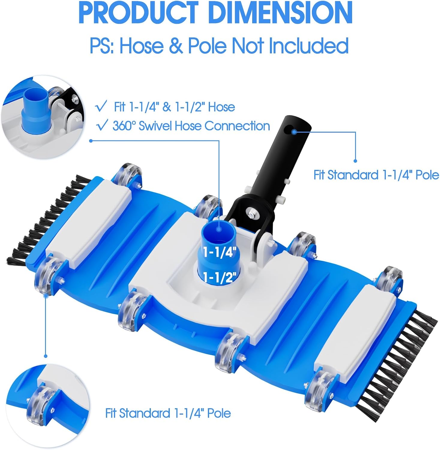 Swivel Hose Connection: Attach our swivel hose connection to your 1-1/4" or 1-1/2" hose and glide across the pool surface.