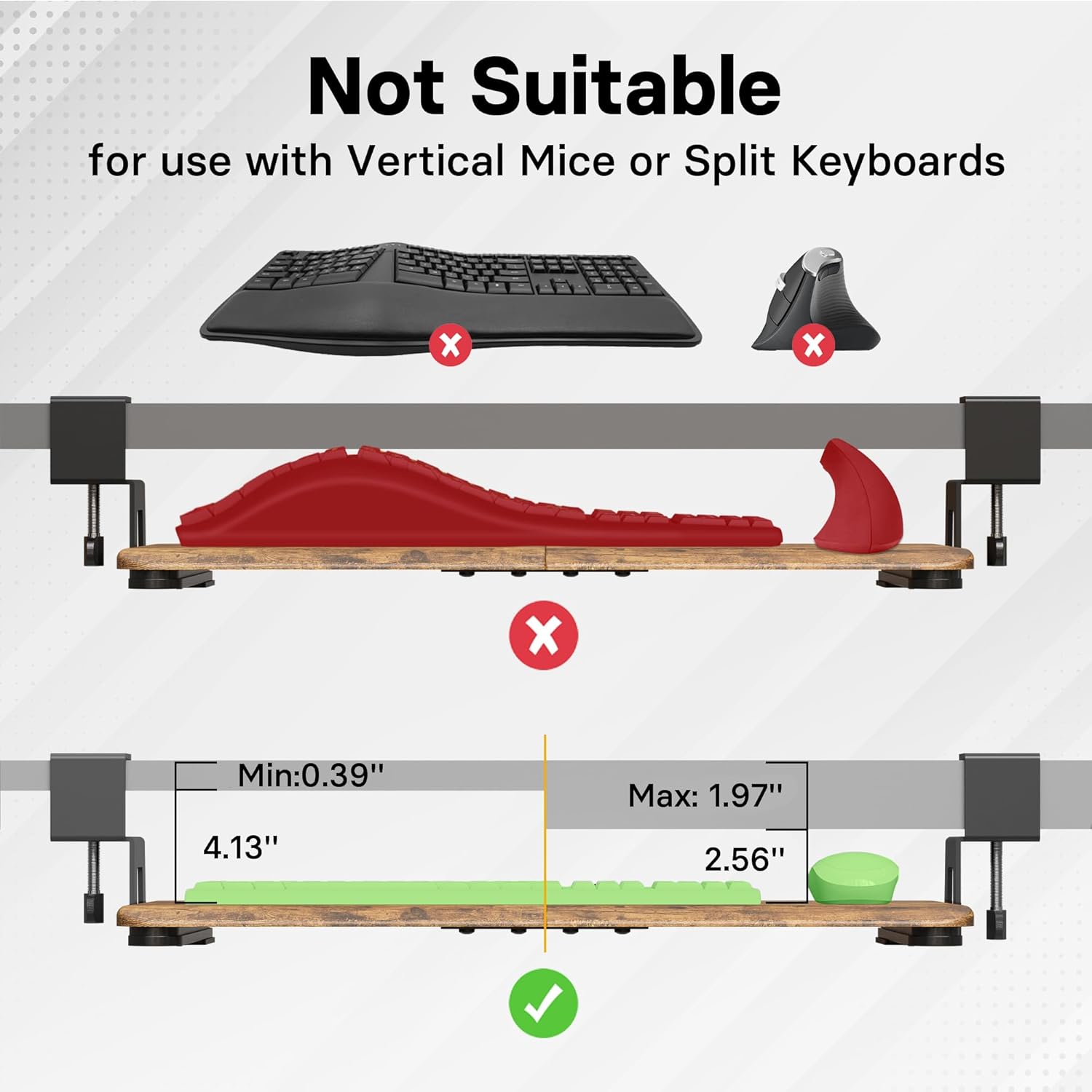 ❗️ CHECK DESK COMPATIBILITY BEFORE PURCHASE – This under-desk keyboard tray won’t work with desks that have curved, beveled, or rounded edges, or crossbars/support beams underneath. Please check the product images to ensure your desk has a flat, unobstructed underside for clamp installation