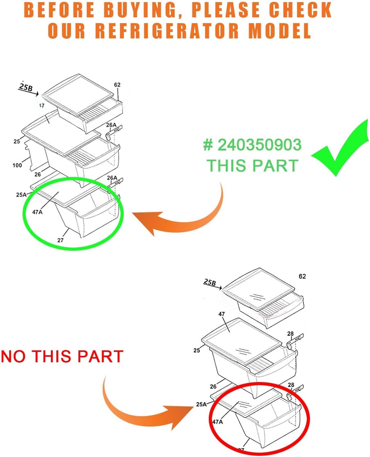 Replace part numbers: 240350903, AP4428230, 1512514, 240350901, 240350902, AH2361213, EA2361213, PS2361213.Compatible with frigidaire refrigerator。