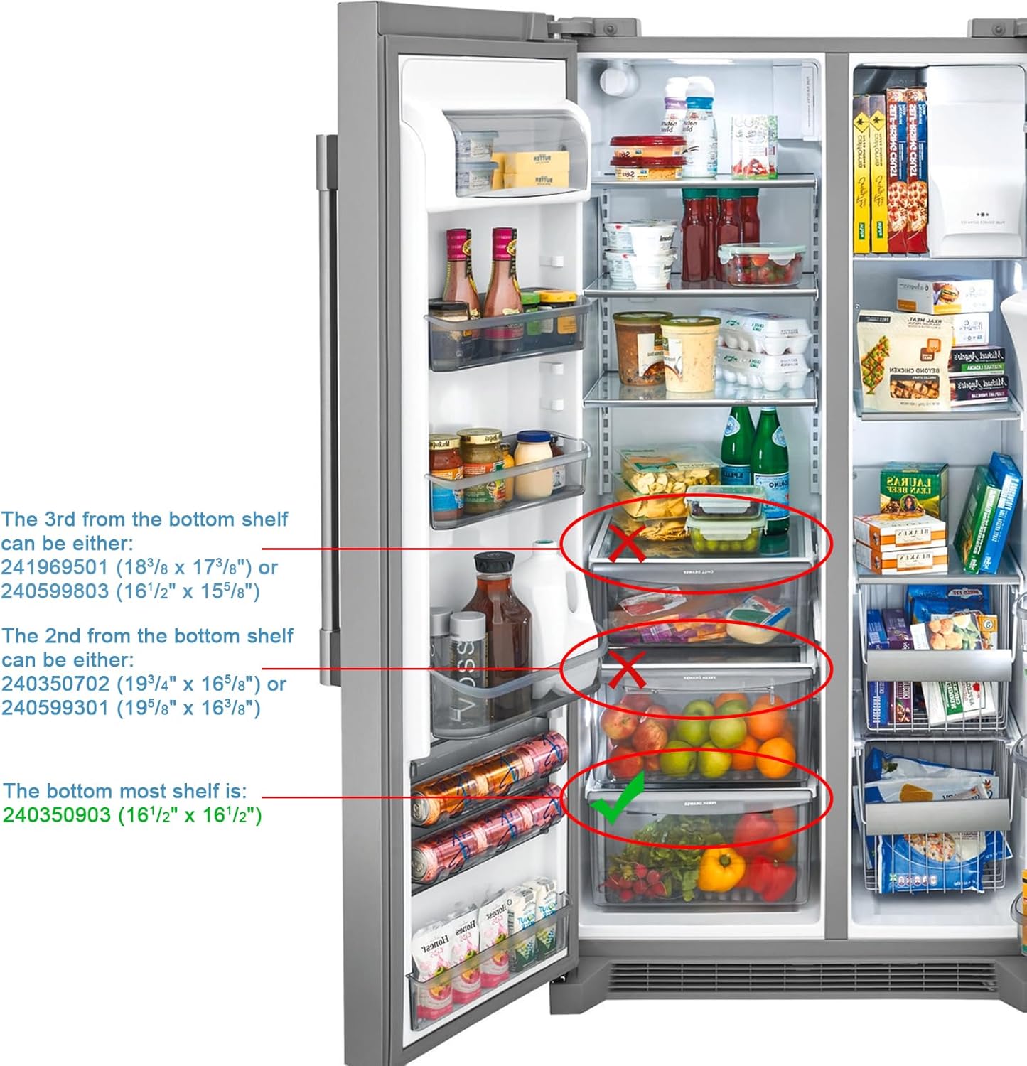 【 Warning】This will fit the BOTTOM crisper cover of the fridge ONLY. If you need the 2nd from the bottom or 3rd from the bottom crisper cover, this will NOT fit. Please note the measurements above - If your cover is 19-3/4" x 16-5/8", then you will need 240350702. If it is 19-5/8" x 16-3/4” then you will need 240599301 instead.