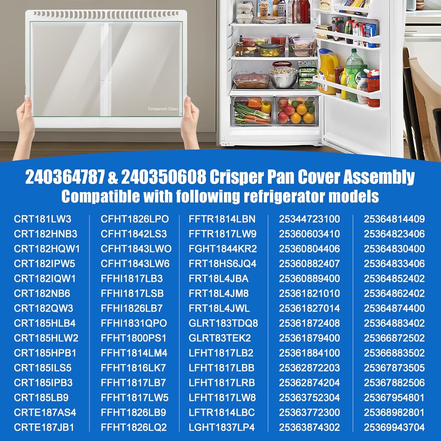 Attention Don't buy wrong! 240364787 and 240364790 are very similar, but their sizes are different, please confirm the size and model of your fridge before making a purchase. 240364787 Crisper Drawer Cover diameter size: 25.5x19 inch; 240364790 Crisper Drawer Cover diameter size: 25x20.5 inch. Complete replacement kit & expanded compatibility: Includes UPGRADED 240364787 Crisper Drawer Cover 240350608 Crisper Glass. Directly replaces OEM parts: Drawer Cover: 240364787, AP4432913, PS2363600, 216979402, 216995502, 240364714/725/747/764/778/794, 1512532, AH2363600, EA2363600. Crisper Glass: 240350608, 240350608RC, AP2115928, 240350650/643/655, 297012700, 297194400, 241711220/219/270, AH429963, EA429963. ✔️ Fits Frigidaire, Kenmore, Electrolux, Gibson, Kelvinator models including: FFTR1814TWB/TB0/TS1/QB0, LFTR1832TF0/TE0, FFHT1831QQ2/QE2, CFHT1842LS3, DFHT1843MW3, CRT185HLB0, 253.78893016, 253.62872203, 253.73754300, BLRT86TESA. Precision fit & humidity control technology: Engineered to exact OEM dimensions (Drawer Cover: 25.75" x 18.75" x 1.75" | Glass: 23.8" x 15.4") with interlocking card slots for seamless integration. Features humidity-sealed design with adjustable vents to regulate moisture levels – extends produce freshness by 30%. Industry-leading durability: Drawer Cover: Reinforced food-grade polymer with anti-warp core (supports 50 lbs). Center pillar reinforcement prevents sagging. Crisper Glass: 5mm tempered safety glass with sandblasted edges (shatter-resistant, fingerprint-proof). 75% stronger than standard glass. Smooth installation & daily use: Slides effortlessly on factory tracks – no tools required (<2 min install). Low-friction glide system ensures buttery movement even when fully loaded.