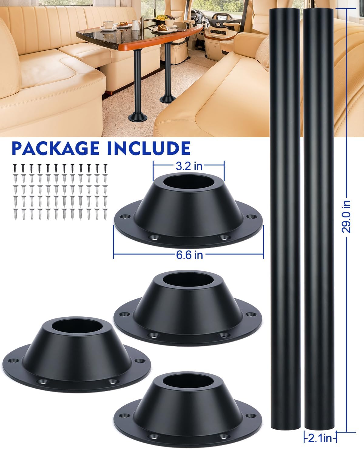 2pCs Size 29" HIGH-QUALITY ALUMINUM CONSTRUCTION - Crafted from premium aluminum, the RV table legs and base mount system provides reliable, sturdy support for your RV table. The corrosion-resistant, rust-proof aluminum ensures the system stands up to the rigors of travel use.