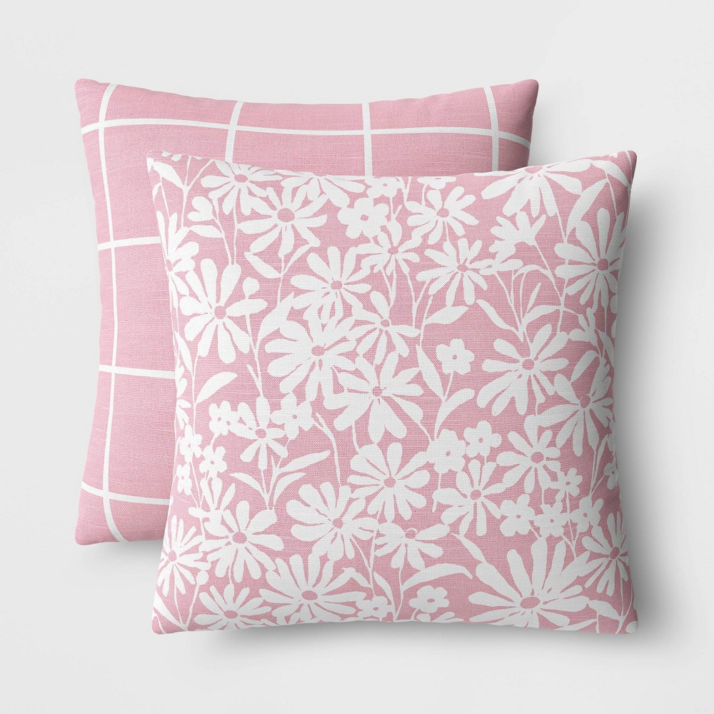 2pk Daisy and Grid Printed Woven Cotton PIllows Pink - Room Essentials™: Indoor Square Cushion Set, OEKO-TEX Certified