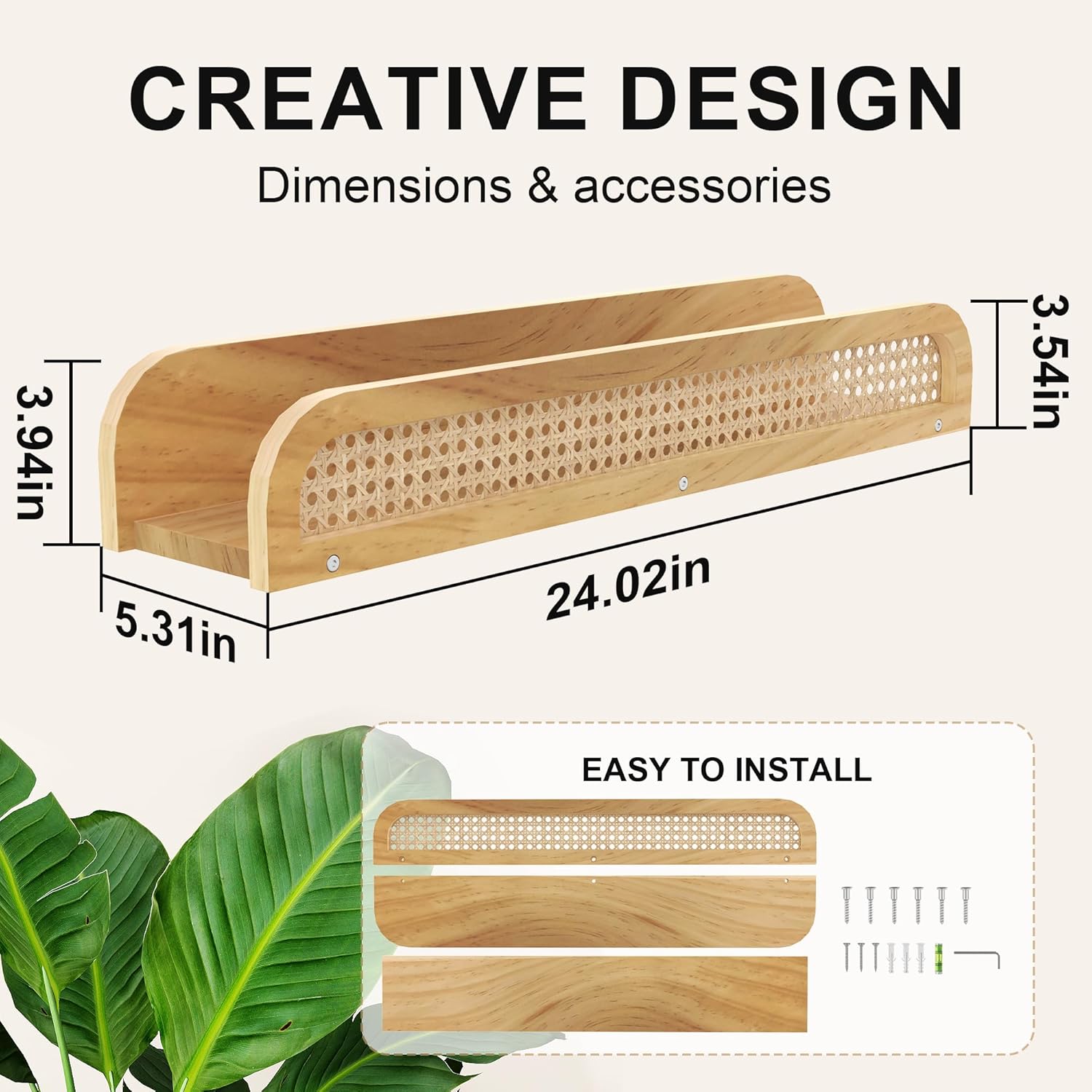 2pk Rattan Wall Shelf, Natural Boho Bookshelves for Wall, Modern Wooden Wicker Shelf, Cute Nursery Shelves, Floating Shelves for Kids Room, Living Room, Bedroom