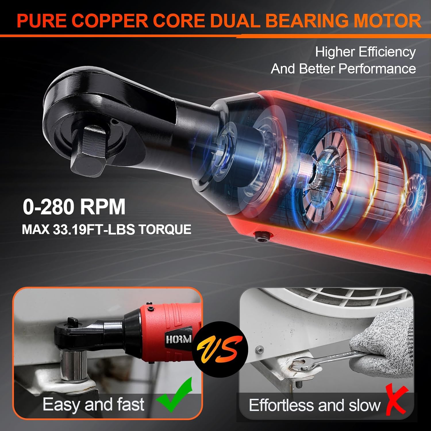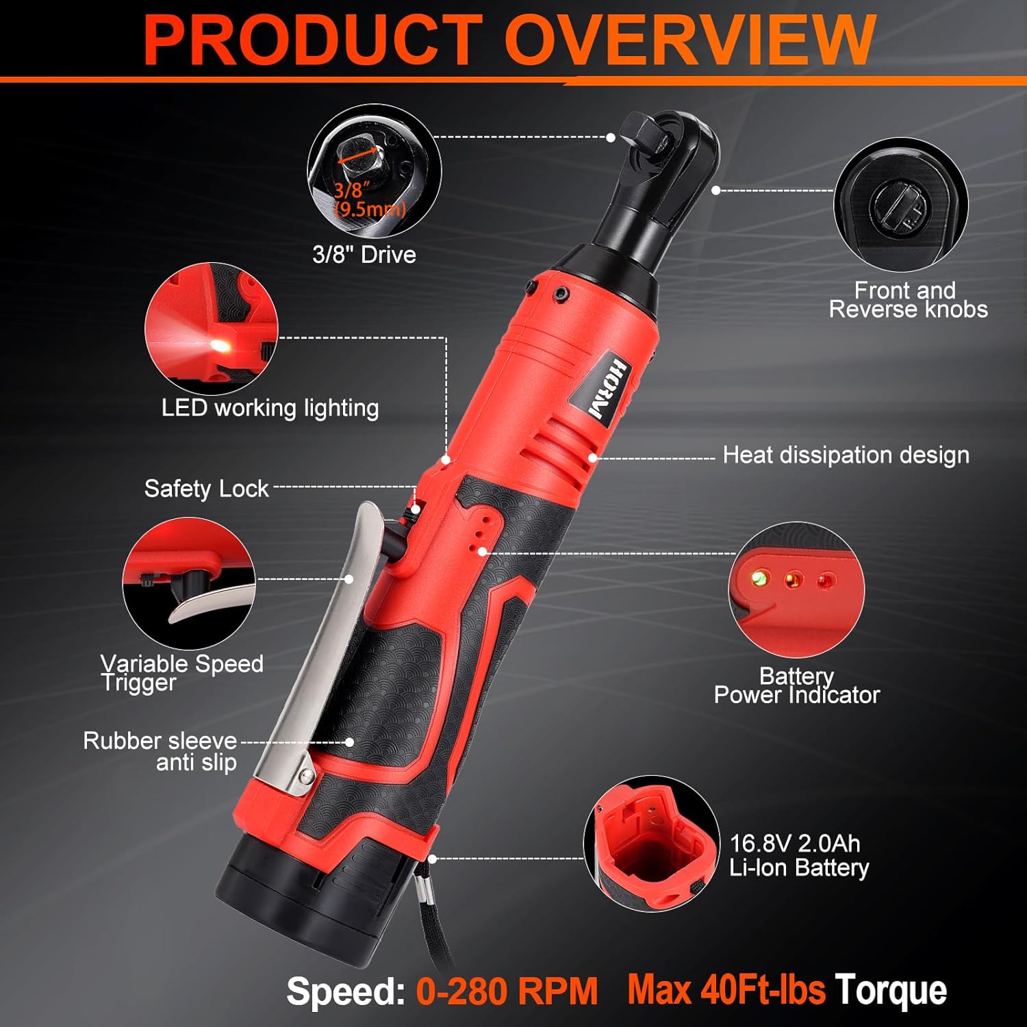 Easy To Use: Electric wrench ratchet has a forward and reverse function, which can be used for disassembly or tightening;A slender electric ratchet 3/8 drive,combined with a streamlined head design,allows the wrench to work easily in narrow spaces;0-280RPM variable speed trigger,convenient for flexible control of electric ratchet wrench operational speed;It weighs only 2.13 pounds(including battery),so cordless ratchet wrench can be used with one hand for a long time without feeling fatigued
