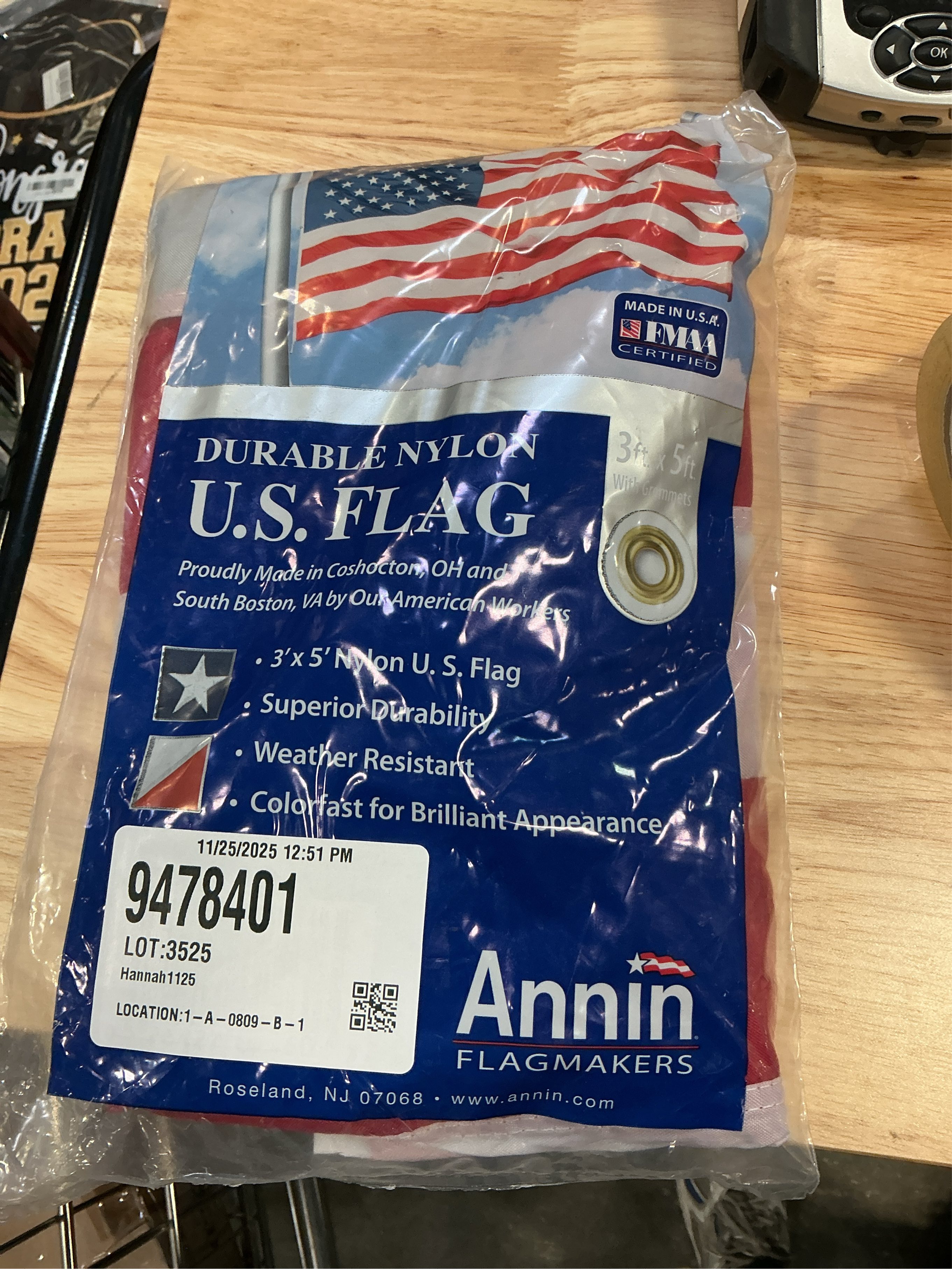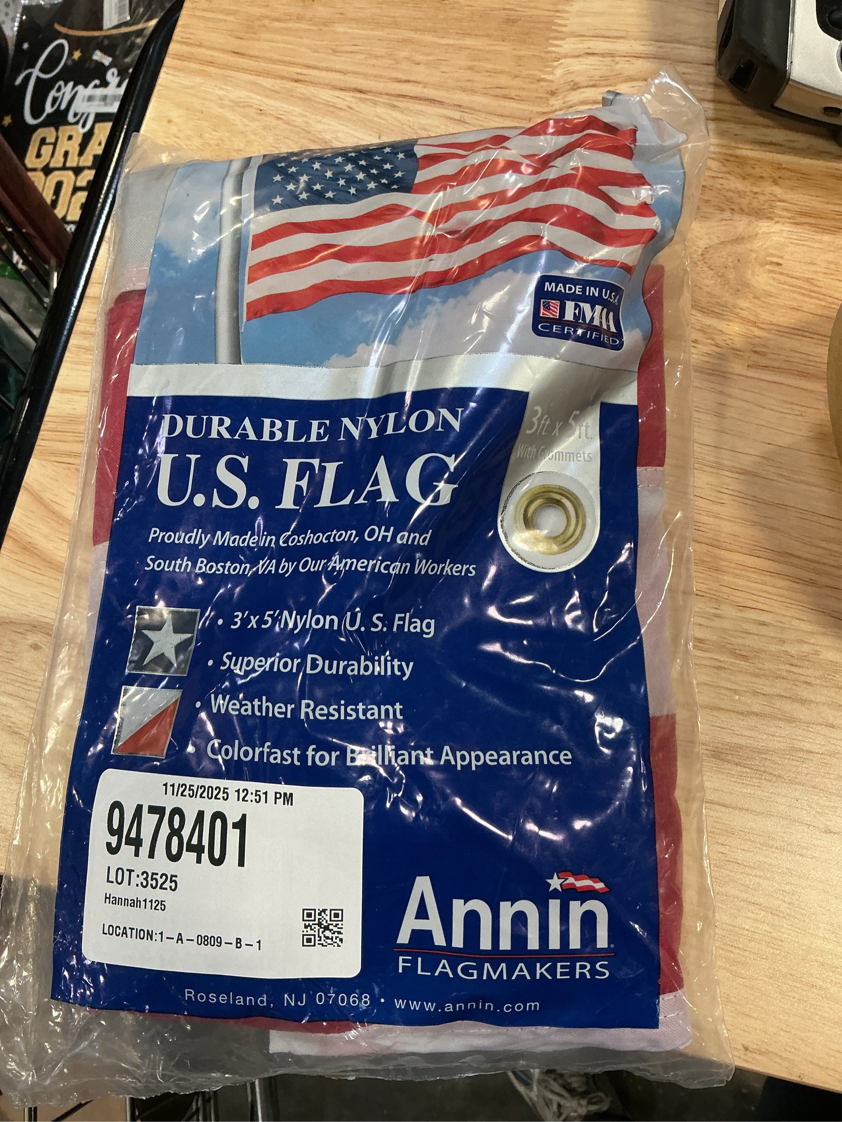 This Flag features sewn stripes and embroidered stars and is from SolarMax Nylon. This is our most popular Flag material. Annin Flagmakers dyes its own ColorFast Nyl-Glo U.S. Flags. Banner/Flag Type: Grommeted. Made in USA: Yes. Material: Nylon (100%). Origin: USA. Outdoor Living Product Type: USA Flag. Product Weight (lb.): 0.9 lb. Approximate Size (WxL): 3 x 5. Assembled Depth (in.): 0.125 in. Assembled Height (in.): 36 in. Assembled Width (in.): 60 in. Flag length (in.): 36. Flag width (in.): 60. Flag length (in.): 36. Banner/Flag Type: Grommeted. Flag width (in.): 60. Approximate Size (WxL): 3 x 5. Outdoor Living Product Type: USA Flag.