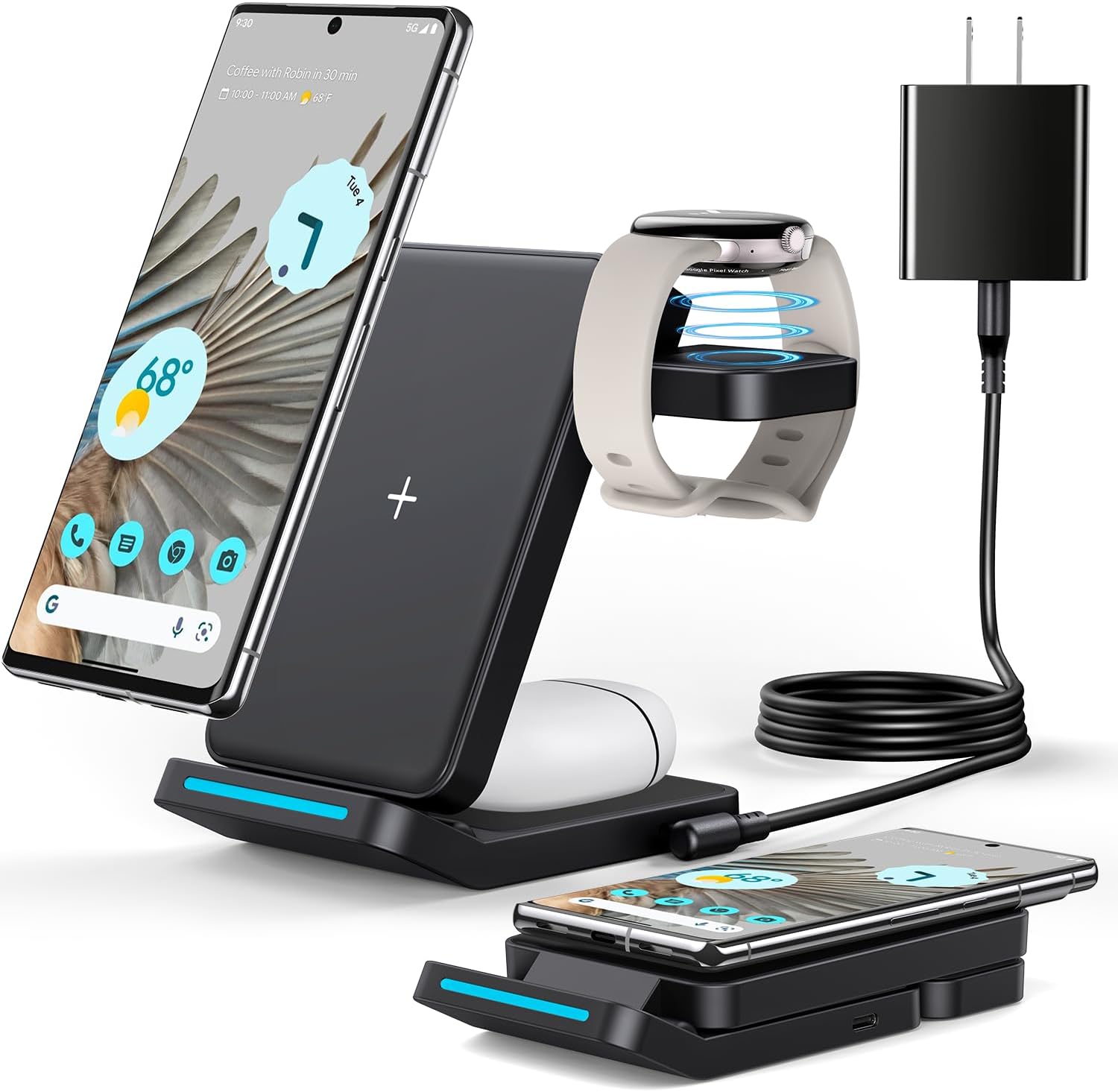 3 in 1 Foldable Wireless Charger for Google Pixel Watch 1(Not for Pixel Watch 4/3/2), Fast Charging Stand Station for Pixel 10 Pro XL/9 Pro XL/10/9/8/7/6 Pro, Travel Charger with QC Adapter, Black