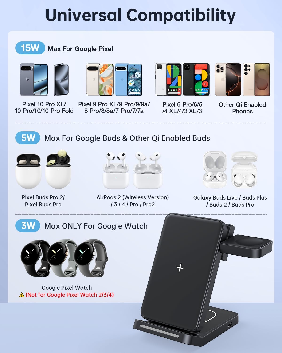 ???? ???????? ???? ???????????????????? ???????????????????????????????? ???????????????????????????????? ????????????????????????????: This foldable wireless charger stand can provide 15W Max for Google Pixel 9 Pro/9 Pro XL/9a/9; Pixel 8 Pro/8/7 Pro/7a/7, Pixel 6 Pro/6, Pixel 5, Pixel 4/4XL, Pixel 3/3XL, Pixel Fold/Pixel 9 Pro Fold(Not for Pixel 6a/5a/4a/3a/2a); 3W Max Only for Google Pixel Watch(Released in 2022), and 5W Max for Google Pixel Buds Pro/2. It’s also compatible with other brands of phones and buds that support wireless charging