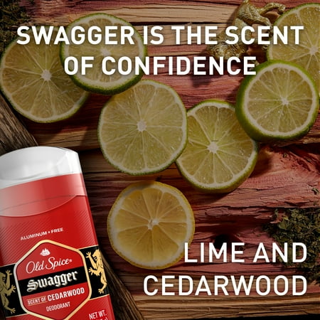 Old Spice Men's Deodorant Aluminum-Free Swagger, 3.8oz has 24/7 ODOR PROTECTION* with daily use Deodorant for Men, Aluminum Free, Helps ELIMINATE Odors Instead of Just Masking ALUMINUM FREE Deodorant for Men Deodorant for Men, Aluminum Free tansforms unfresh men into legends of confidence Deodorant for Men, Aluminum Free with Swagger is the scent of confidence, which happens to smell like lime and cedarwood