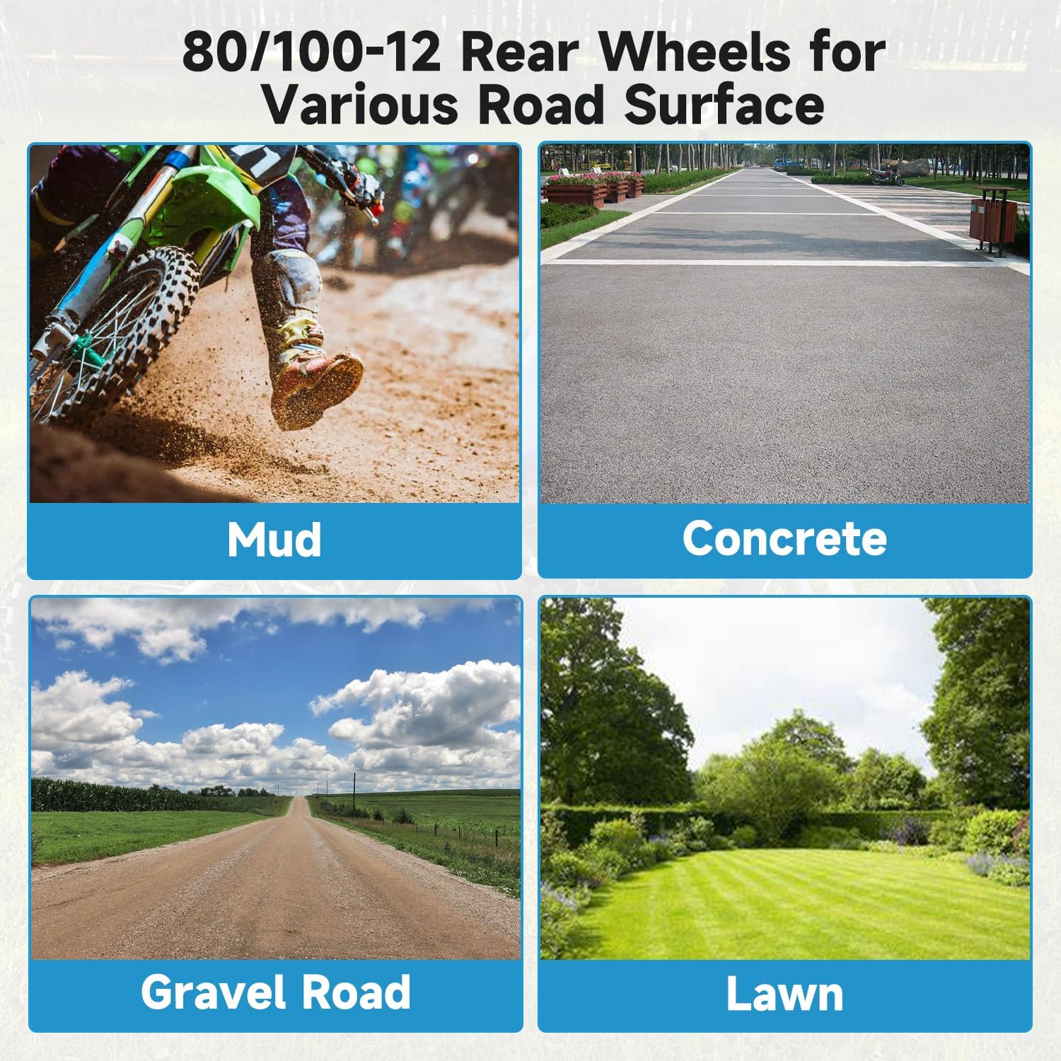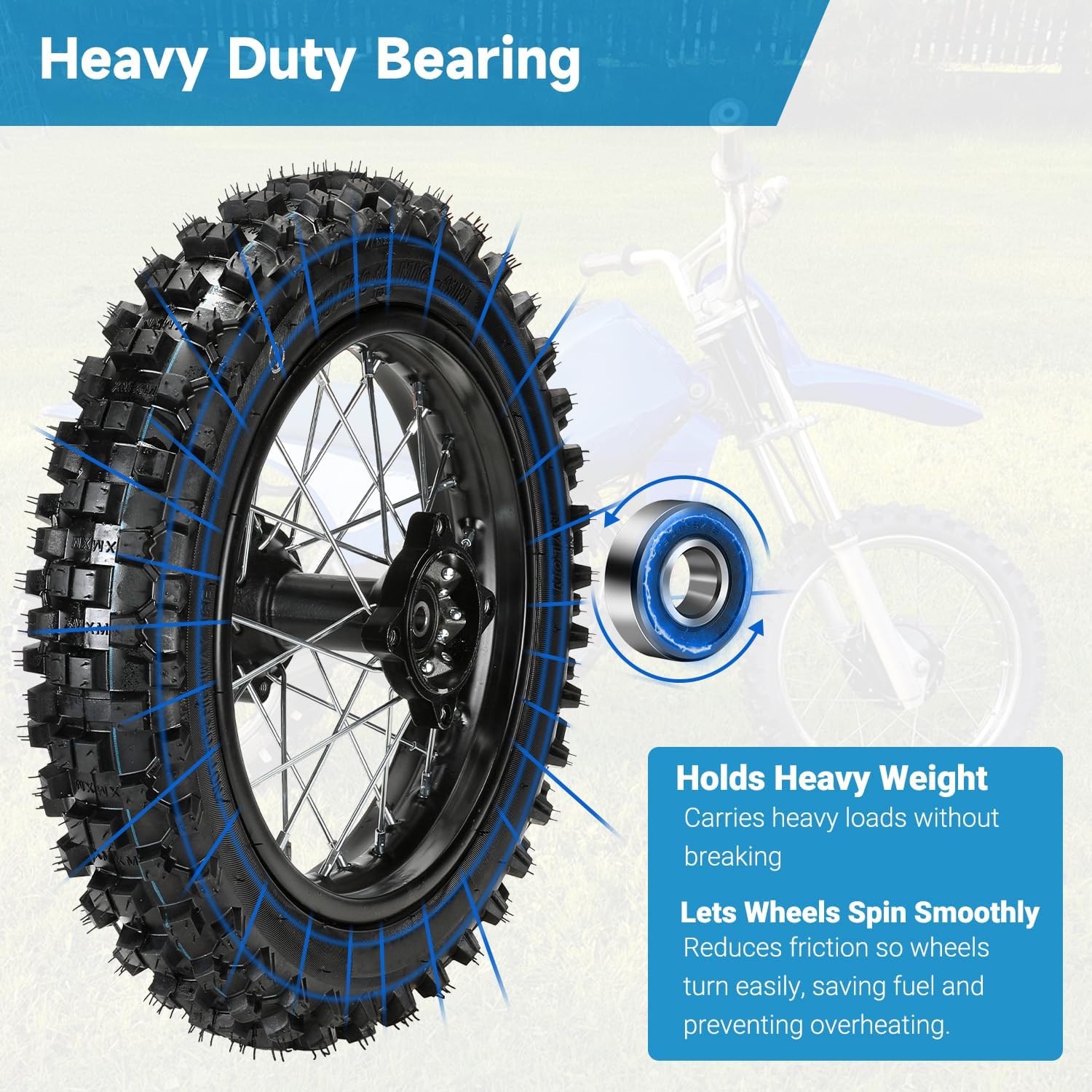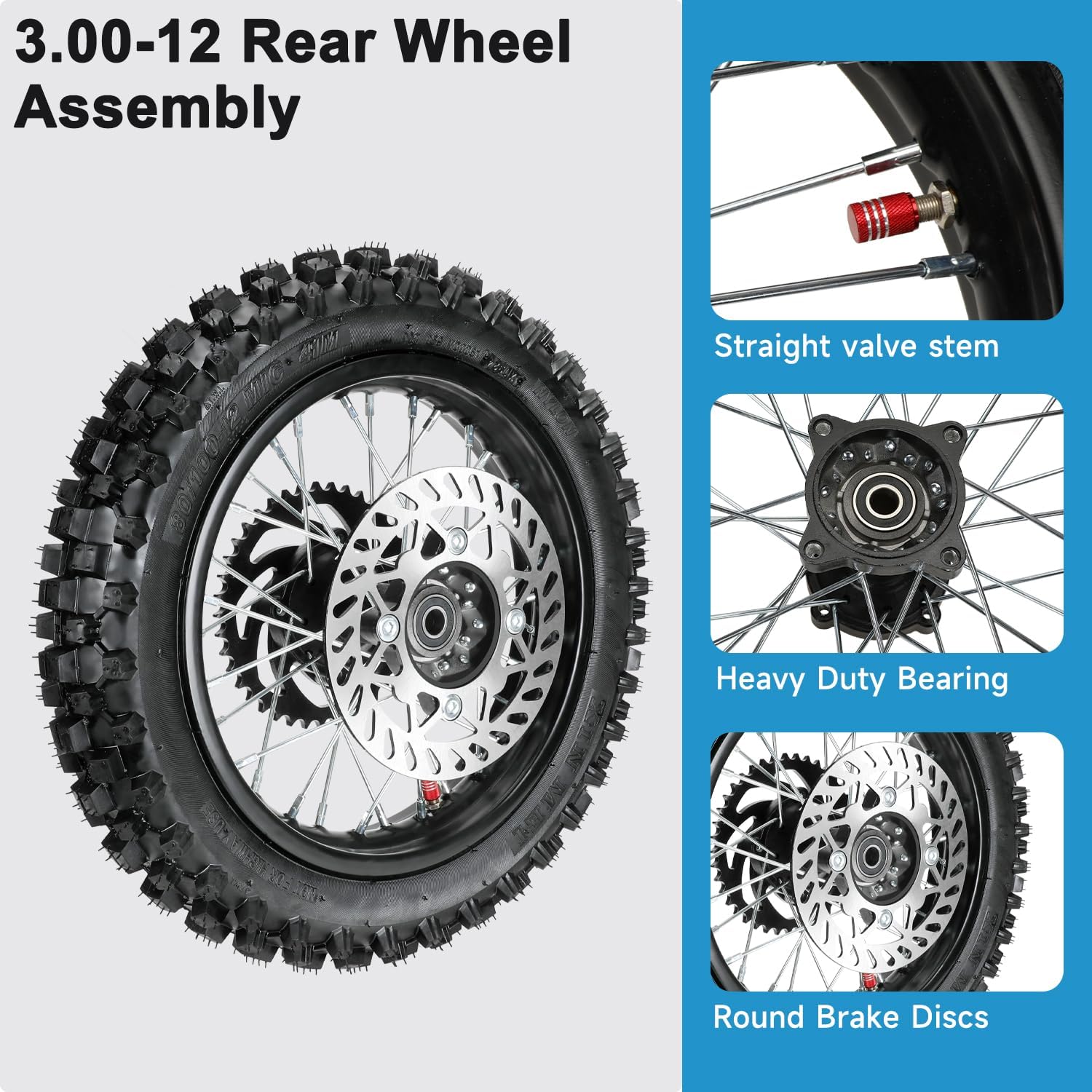 Easy Installation: Whether it's a punctured inner tube or a broken tire, you simply replace the old rear wheel assembly with this 12 inch pit dirt bike wheel, eliminating the need to dismantle and individually replace worn tires. This entire tire replacement is faster and more efficient than dealing with individual components