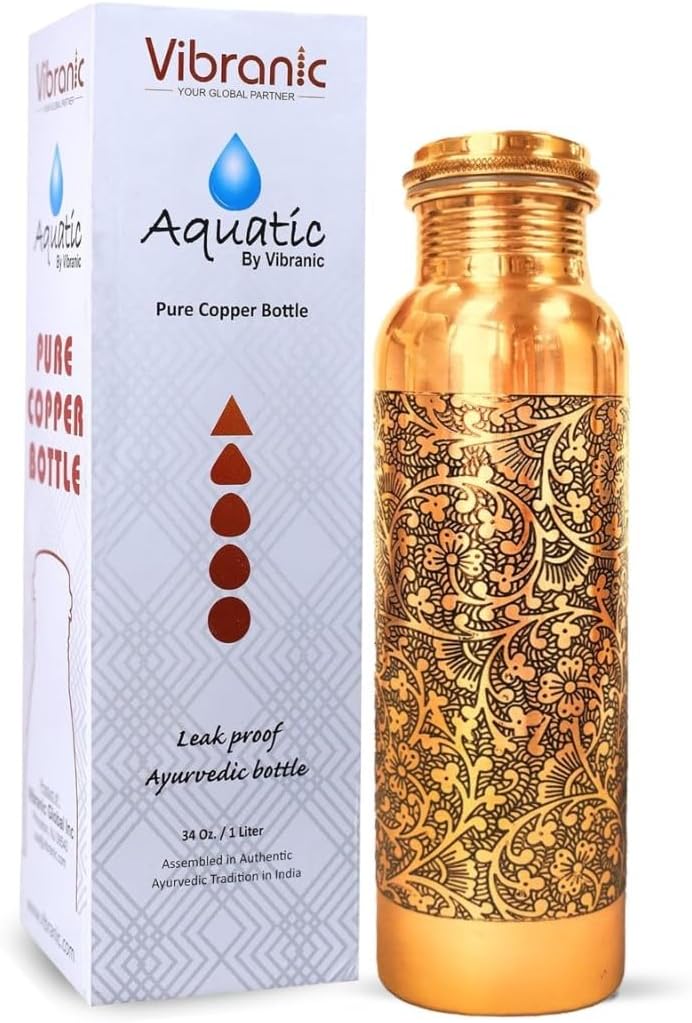 34oz Aquatic DARK EMBOSSED Ayurvedic Copper Water Bottle 34oz - Pure Copper Bottle for Sports, Fitness, Yoga - Natural Health Benefits - Made in India