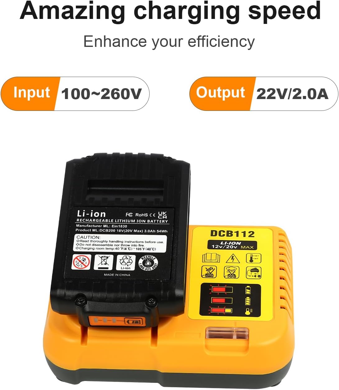 12V/20V Charger Compatibility: Replacement for dewalt battery charger supports 100-260V, which is 100% compatible with dewalt 20v battery DCB200 DCB120 DCB201 DCB203 DCB204 DCB206, etc. Excellent compatibility can meet the charging requirements of your battery.