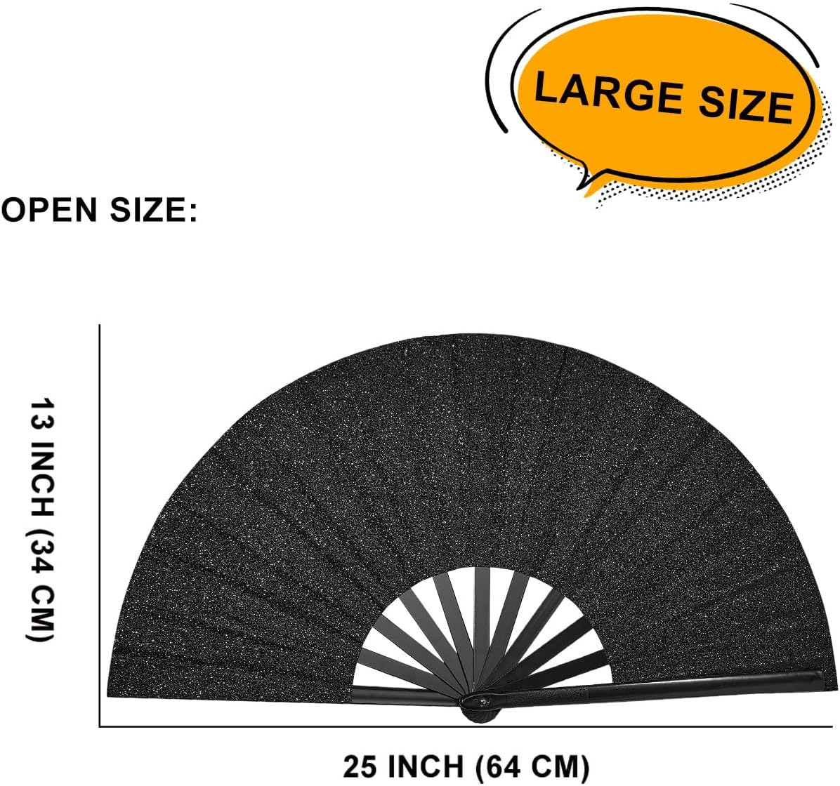 Large Handheld Folding Fan Size: Folds to compact size 13 x 1.5 x 1 inches. Unfolding size 13 x 25 inches. With a larger size than most hand fans, this product is great for creating an even bigger impact at raves, music festivals, and other events.