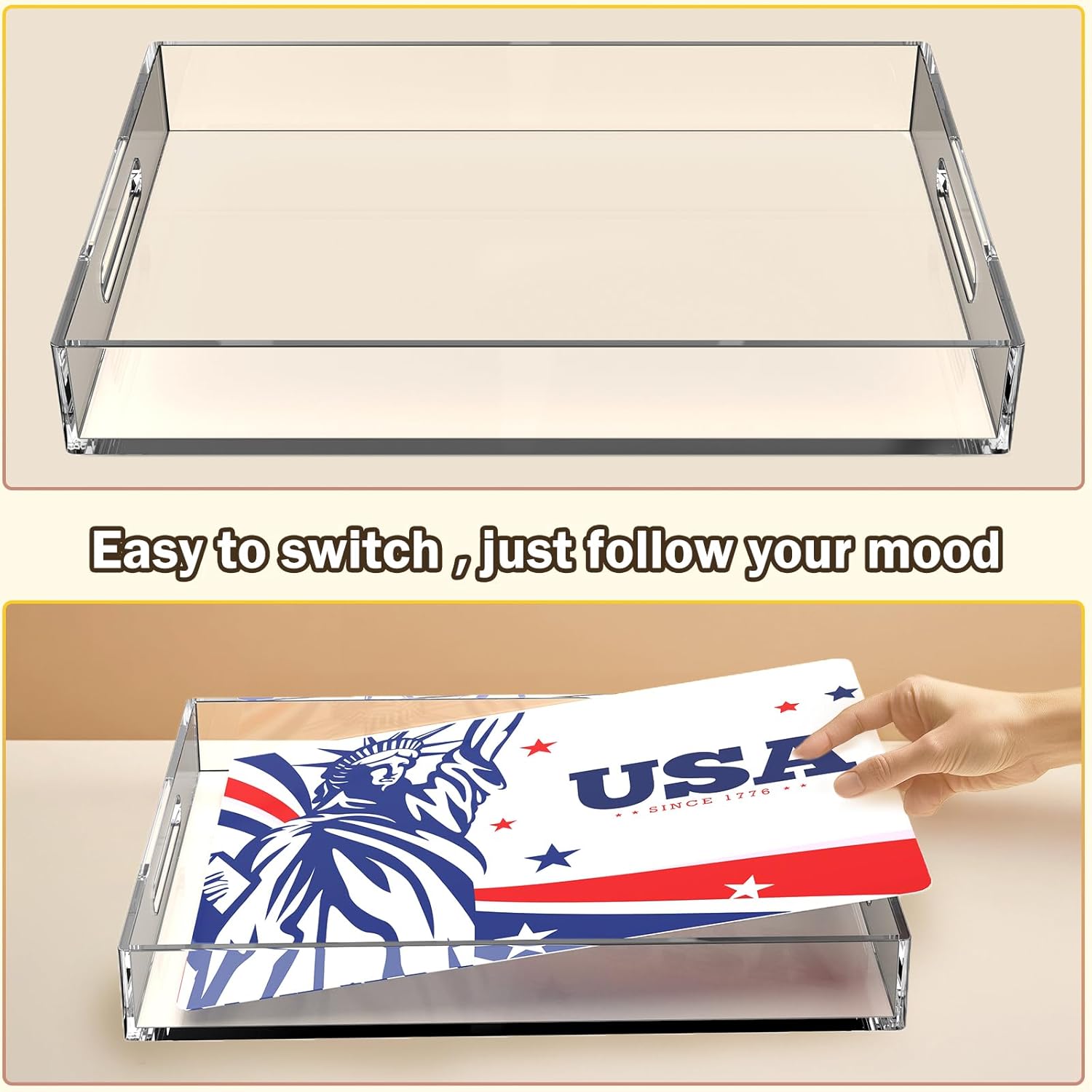 【 INTERCHANGEABLE INSERTS FOR CUSTOM LOOKS】Switch designs in seconds with included patriotic red, white, and blue inserts. From summer BBQs to seasonal displays, this customizable tray makes home décor more playful. A perfect decorative tray for coffee tables, entryways, or parties year-round