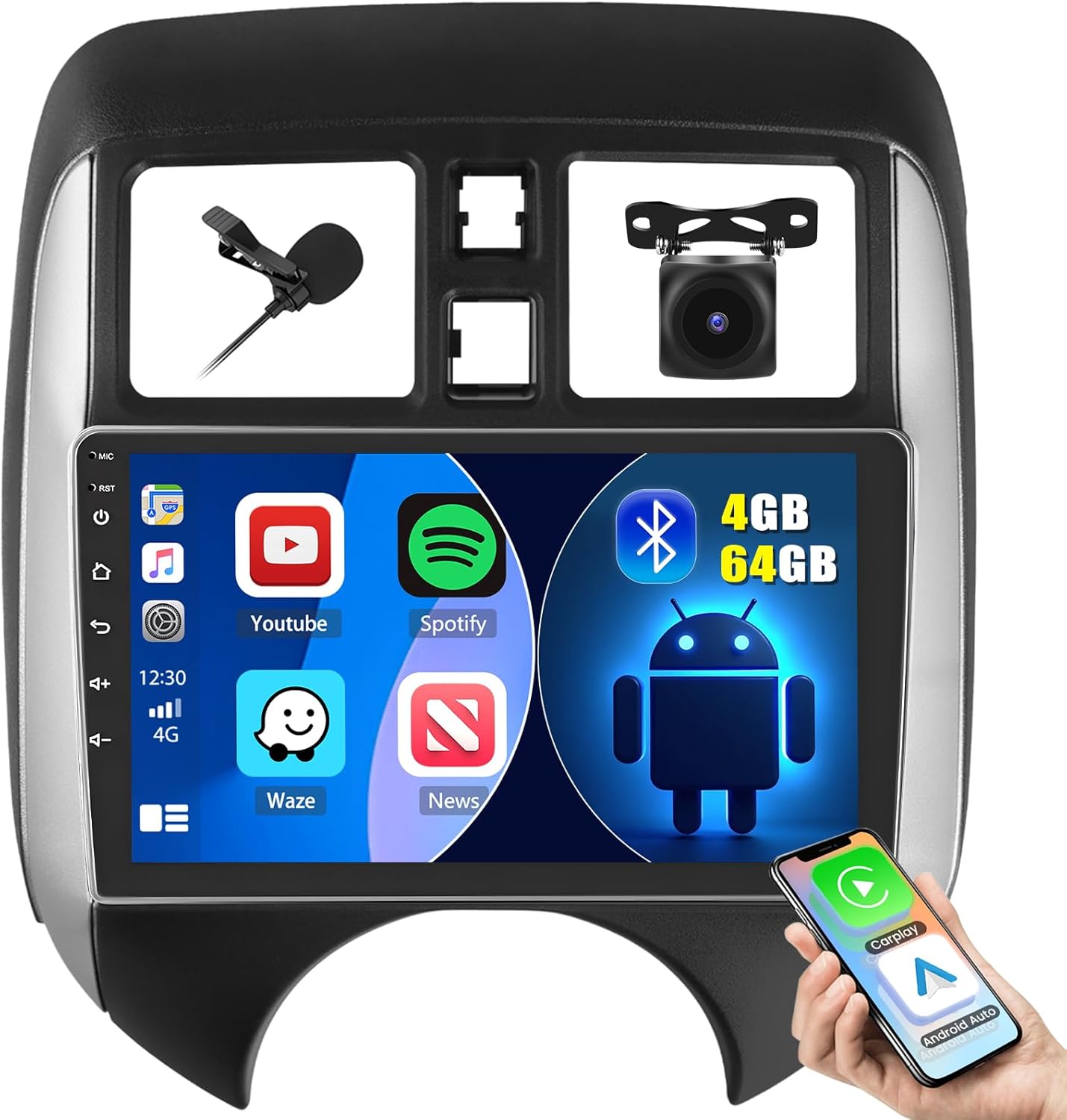 [4 64G] Car Stereo for Nissan Versa Note 2014 2015 2016 2017 2018 with Wireless Carplay Android Auto, 9 Inch HD Touchscreen with WiFi GPS Bluetooth5.0 FM/RDS Radio 32EQ SWC Backup Camera MIC