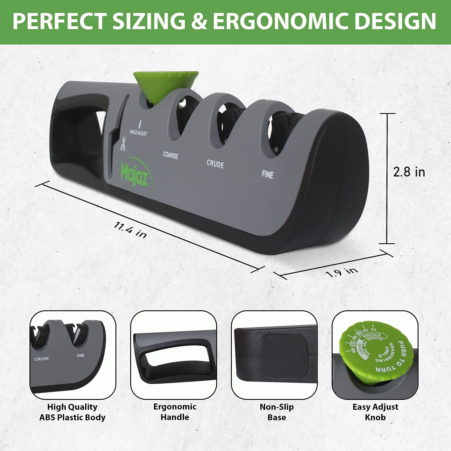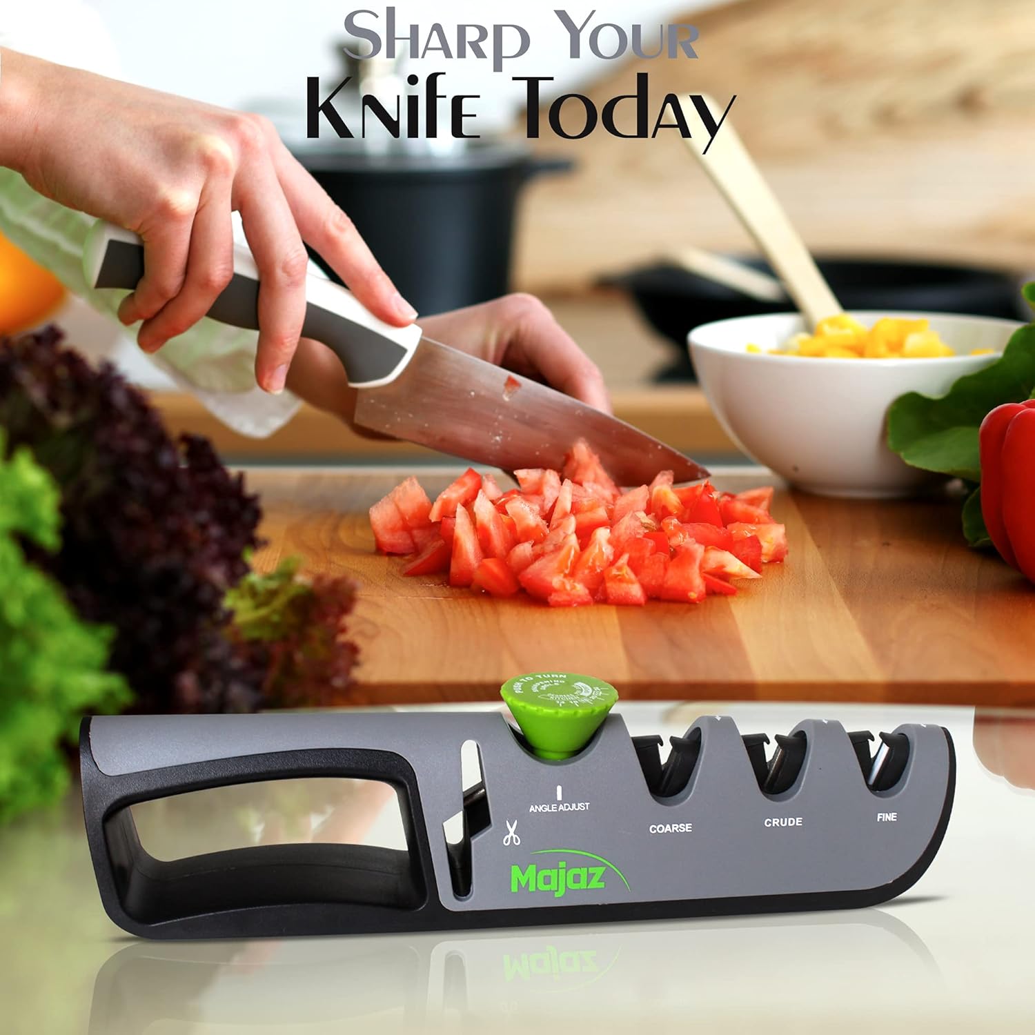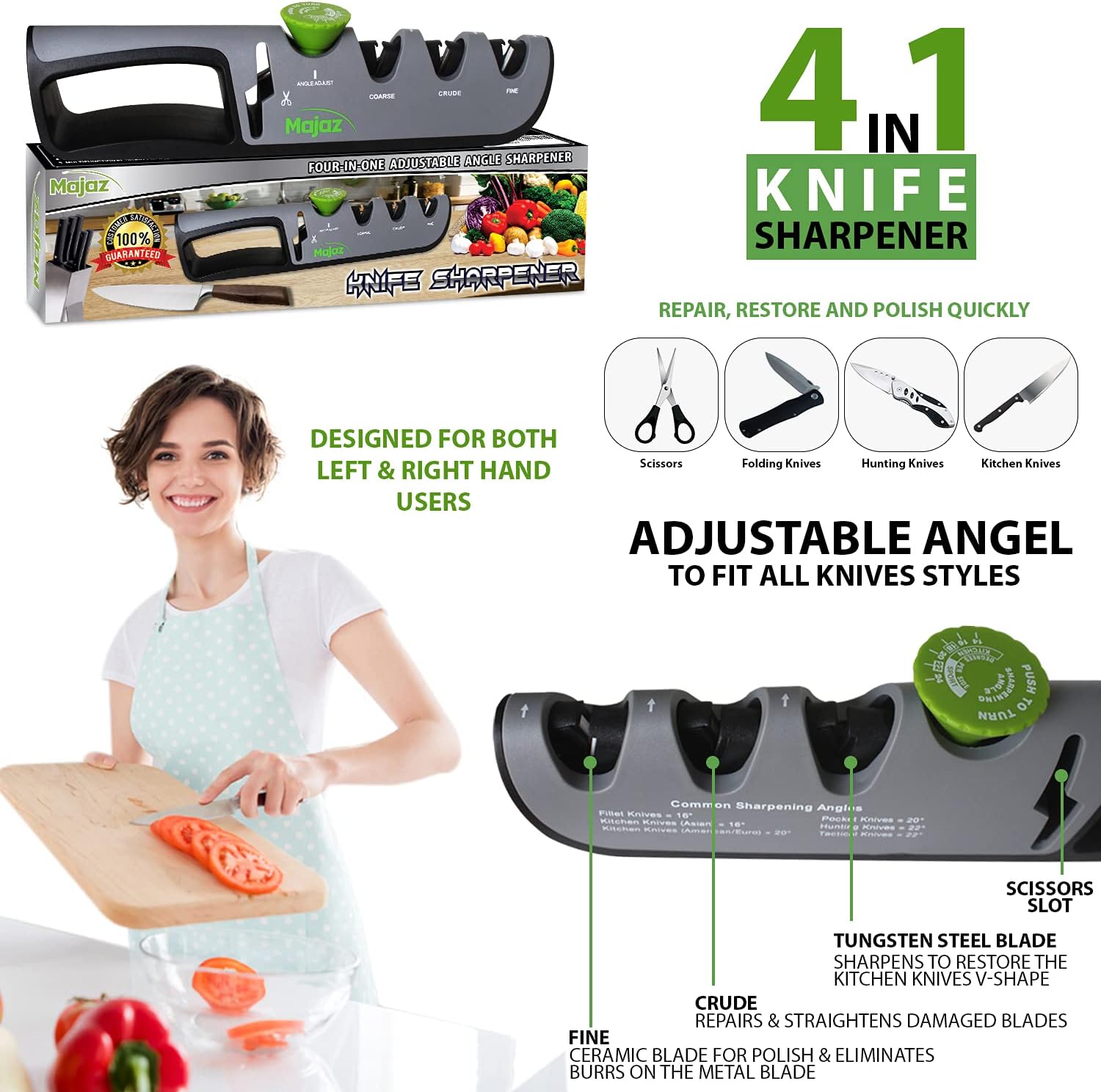 4 in 1 MAJAZ Knife & Scissor Sharpener, Tungsten Steel, Diamond & Ceramic Slots for Different Functions, Adjustable Angel to Fit All Knives Styles ( Kitchen, Fillet, Pocket, Hunting & Tactical Knives)