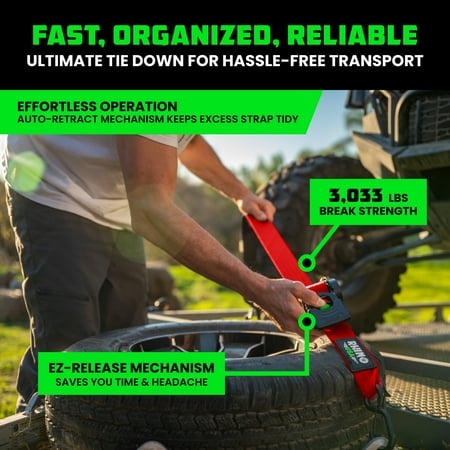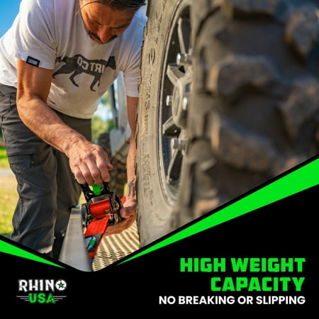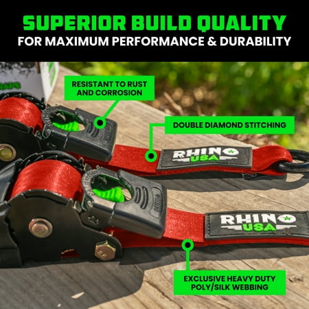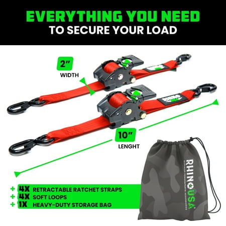 AMERICAN OWNED, FAMILY OPERATED - Join the Rhino USA Family and Support a Father/Son Business With USA-Based Live Phone Support. CHOOSE THE BEST, AVOID THE STRESS - Authentic, High-Quality Retractable Ratchet Straps—Designed and Tested in the USA to Exceed Safety Standards, Ensuring Your Cargo is Secure Without Compromise. INSTANT SELF RETRACTING STRAP - Effortlessly Manage Excess Strap Length with a Simple Click of a Button for Quick and Convenient Use in Any Situation. HIGHEST QUALITY MATERIALS - Equipped with an Electro-Plated Zinc Coated Ratchet, an Ergonomic Padded Handle, and Coated Full Bend S-Hooks for Optimal Durability and Comfort During use. INCLUDES (4) SOFT LOOP TIE DOWNS - Ideal for Creating Secure Anchor Points on Roof Racks, Truck Beds, Handlebars, and More, Ensuring a Versatile and Reliable Tie-Down Solution.