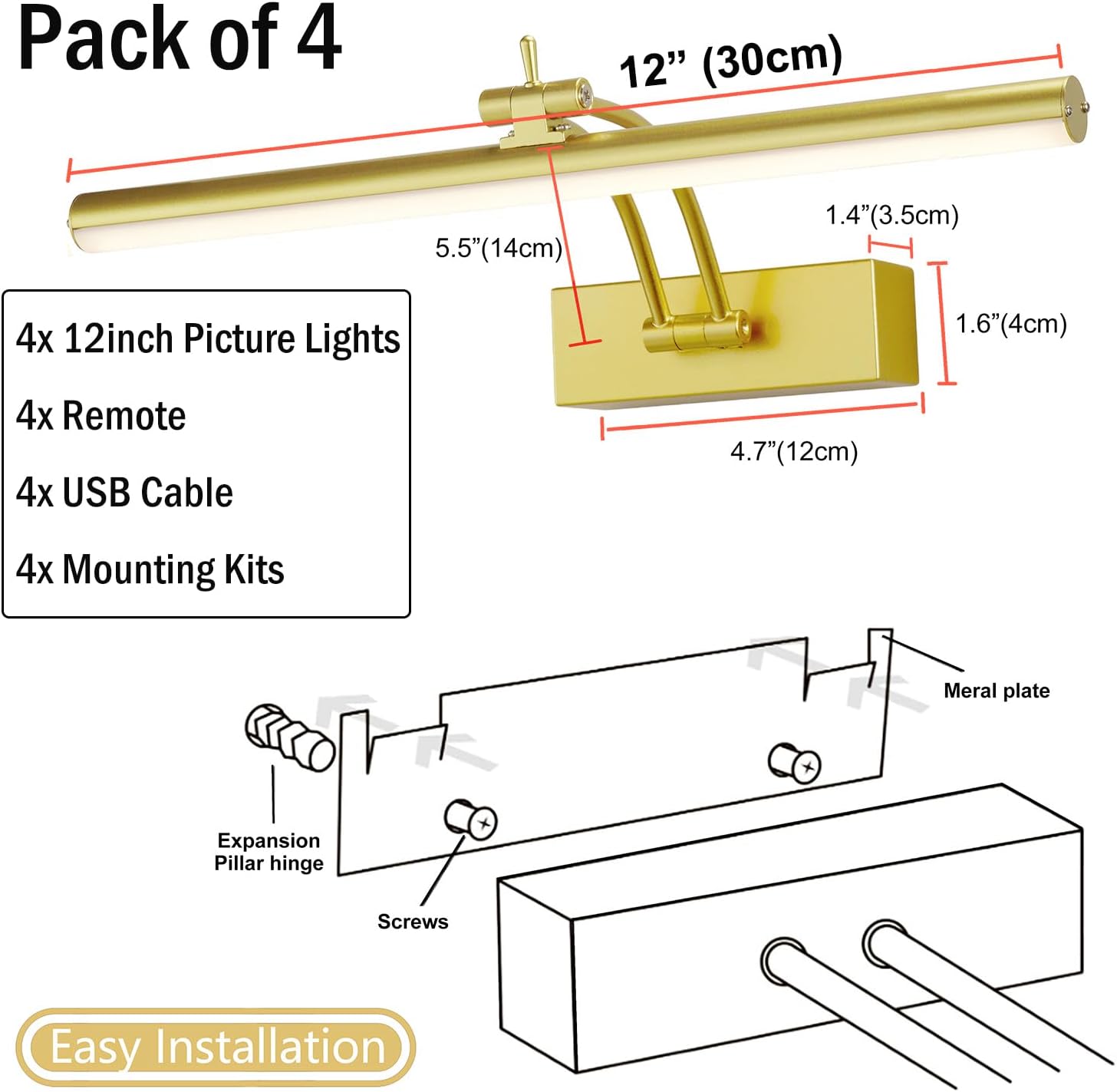 4 Pack Picture Light Battery Operated for Wall, 16" Wireless Art Lighting for Painting, 6 Colors Picture Frame Lights with Remote, Dimmable 5200mAh Gallery Light, Gold