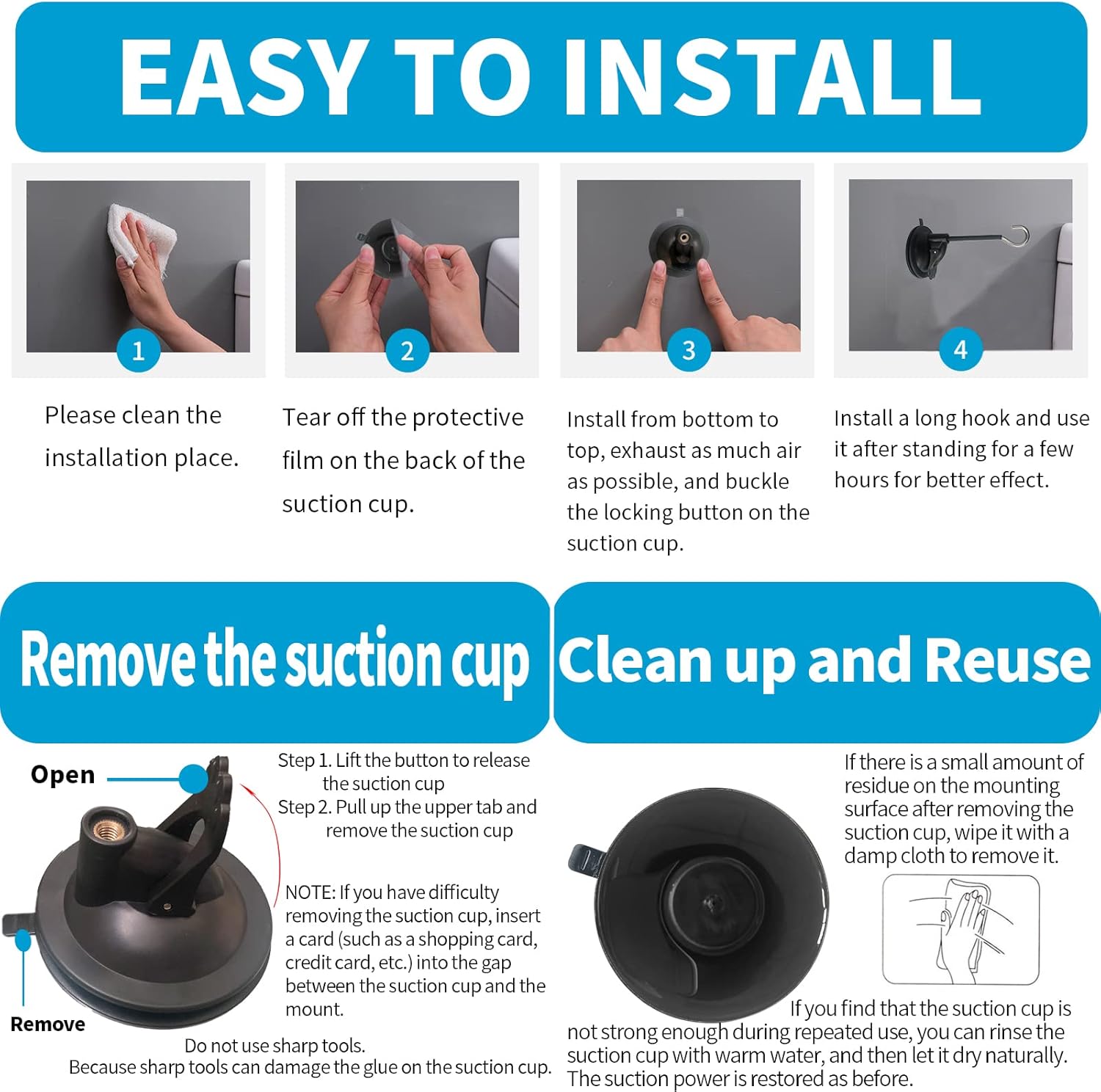 POWERFUL SUCTION: High-quality drop glue suction cup and safety locking mechanism. Large suction cups up to 2.8 inches in diameter with drop glue provide strong adhesion. The suction cup locking feature ensures that there is sufficient pressure to prevent air leakage and loosen the hold