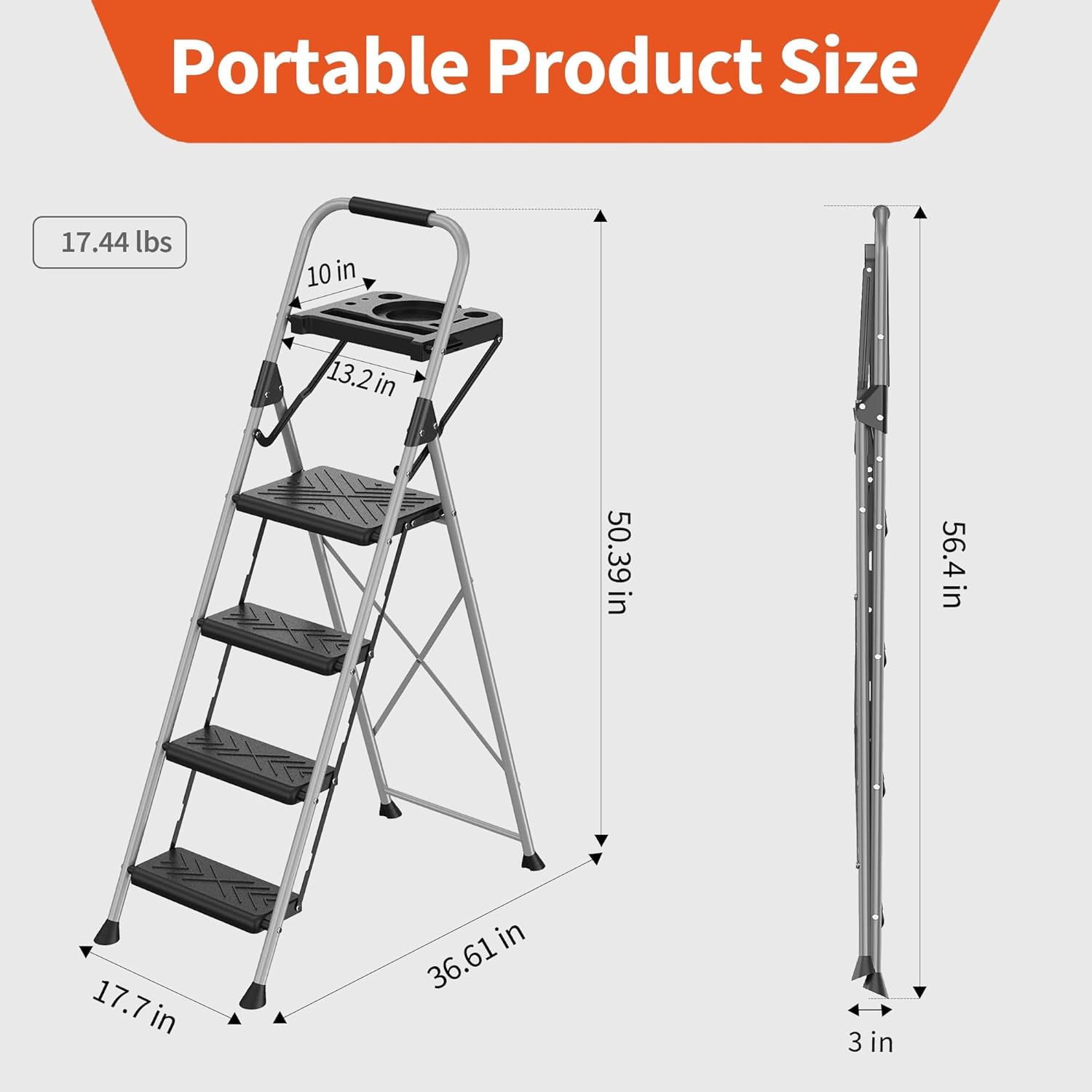 900lbs Sturdy Step Ladder: Featuring the strongest steel structure with tubes up to 0.9mm thick, this ladder has passed 17 reliability tests under ANSI ASC A14.11 standards. With a maximum load capacity of 900 lbs, it offers you exceptional safety and stability!