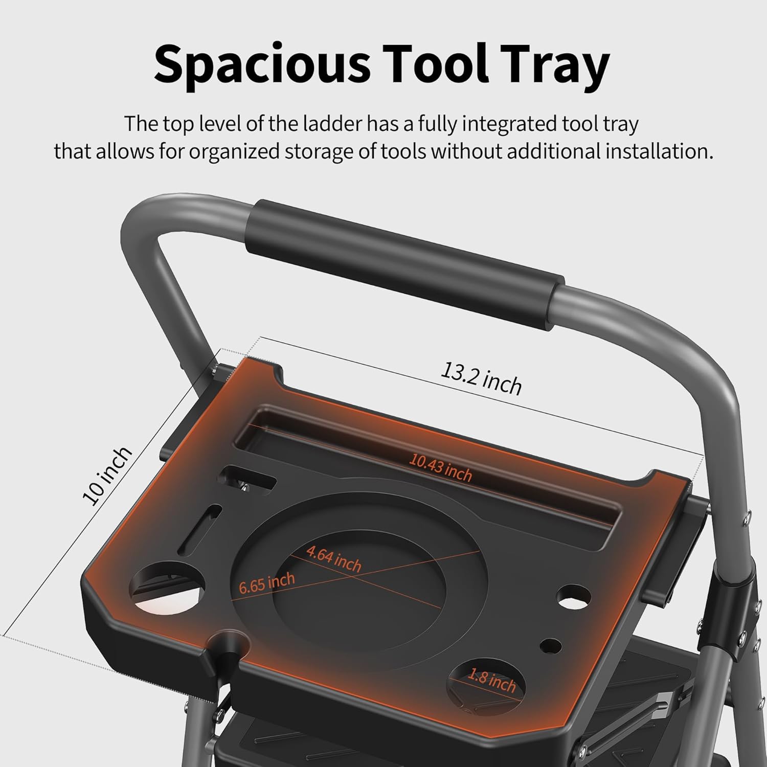 Convenient tool platform:The 4 step folding ladder features an oversized tool tray, ready for use without any additional setup. It holds all your essential tools, reducing the need for frequent trips up and down the ladder, making your tasks more convenient and efficient.