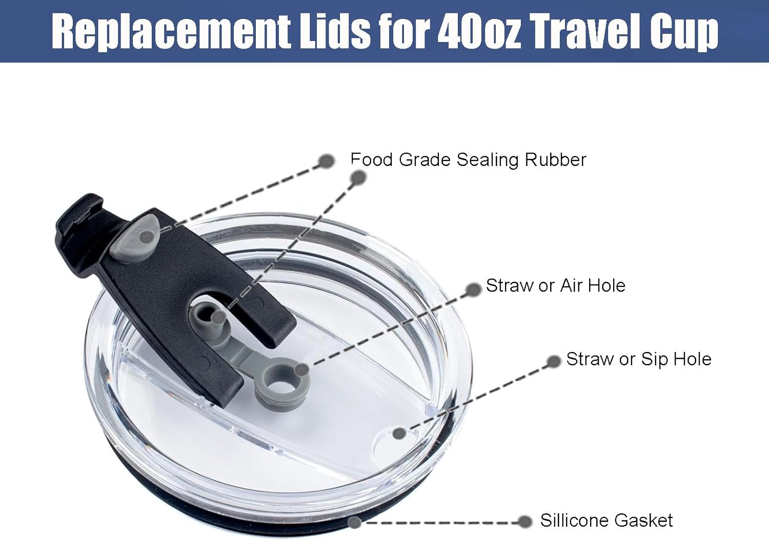 【Spill-Proof Design】The tumbler lids for Stanley cup 40oz have a unique double-sealing designed, which help to avoid water leaking out. The air hole of the lid is designed for straws; Our 40 oz tumbler lid are crystal clear so you can quickly check drink status. Splash and Heat Insulation