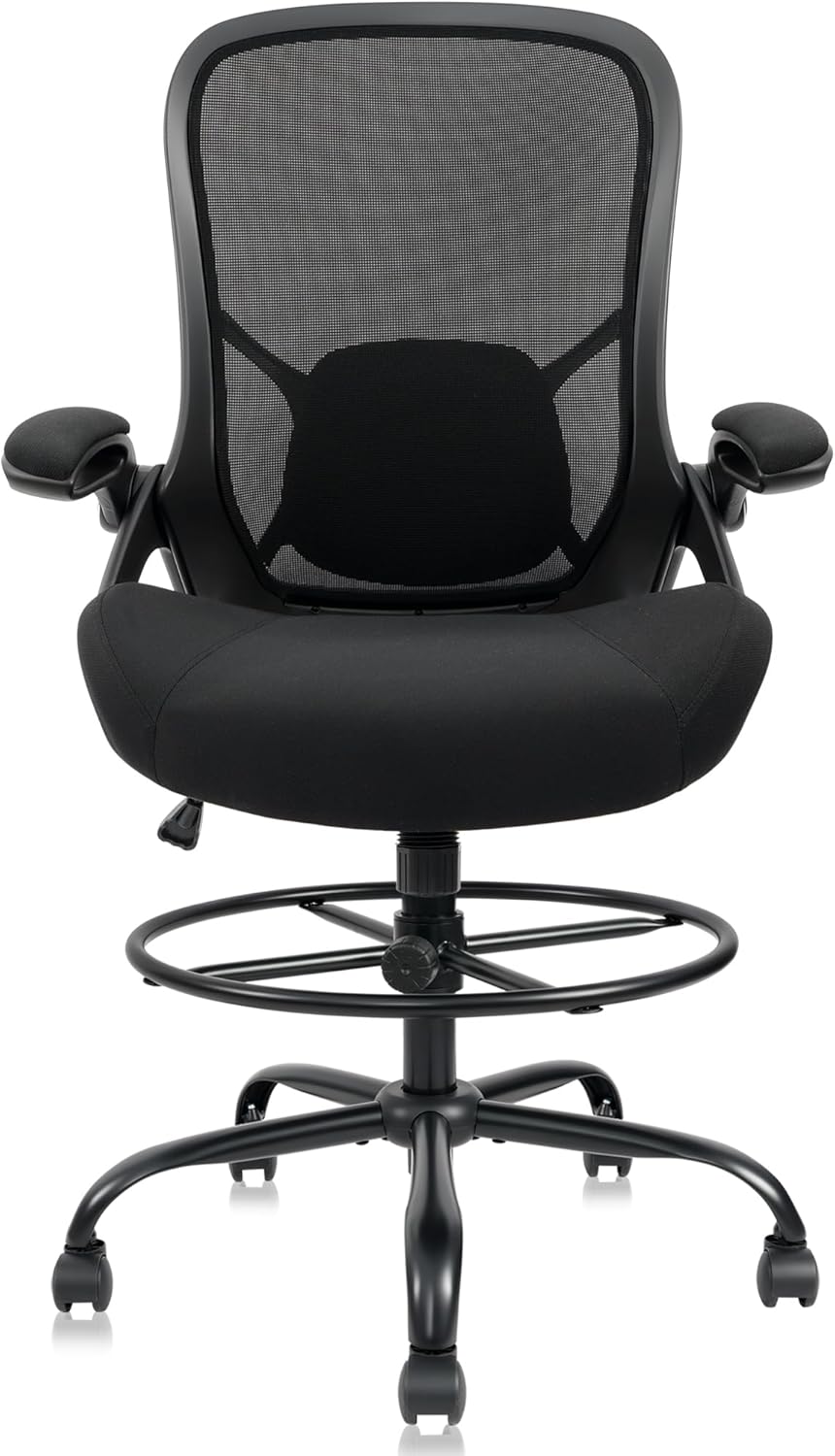 400lbs Heavy Duty Drafting Chair 5" Thickened Seat Office Chair with Flip-Up Armrests Tall Ergonomic Computer Chair with Lumbar Support and Adjustable Footrest Ring Standing Desk Chair (Black)