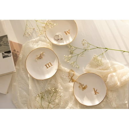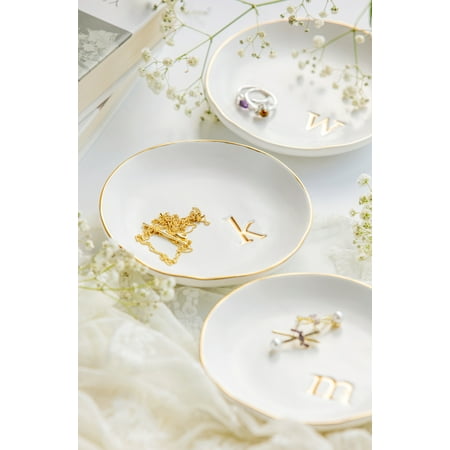 【Dimensions】: This monogrammed ceramic jewelry dish measures 4.75 x 4.75 inches 【Perfect Decor】This tray is not only a container for jewelry, bracelets, necklaces, rings, earrings, keys, but also a perfect decor for your home, office, coffee table, bookshelf, dresser top or any room. 【Material】Made