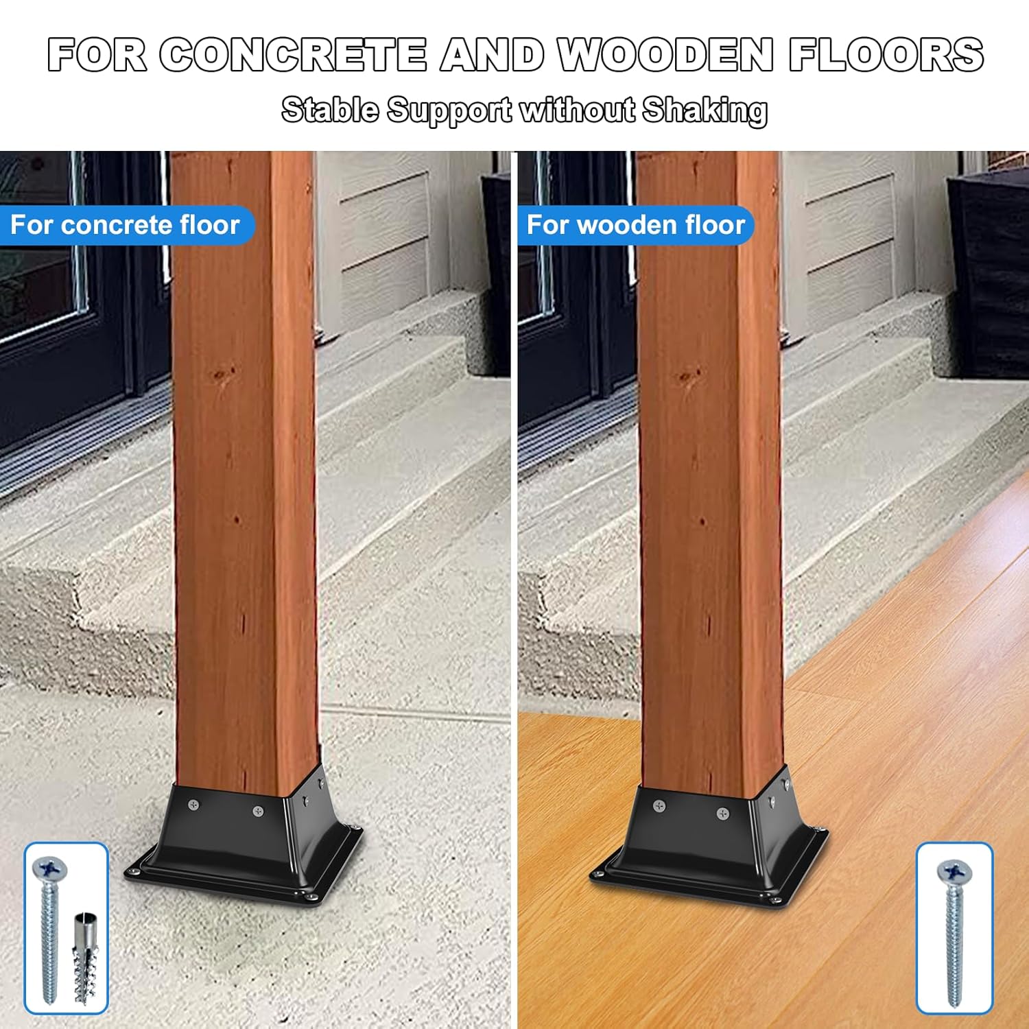 COMPLETE ACCESSORIES--4x4 base post brackets designed for 3.5x3.5 inch wooden posts, with a 6x6 inch bottom outer size and 2.62-inch height for stable, wobble-free support. Includes 10PC metal post base, 80PC self-tapping screws, 40PC self-tapping screws for wood floor, and 40PC expansion bolts for concrete floor.