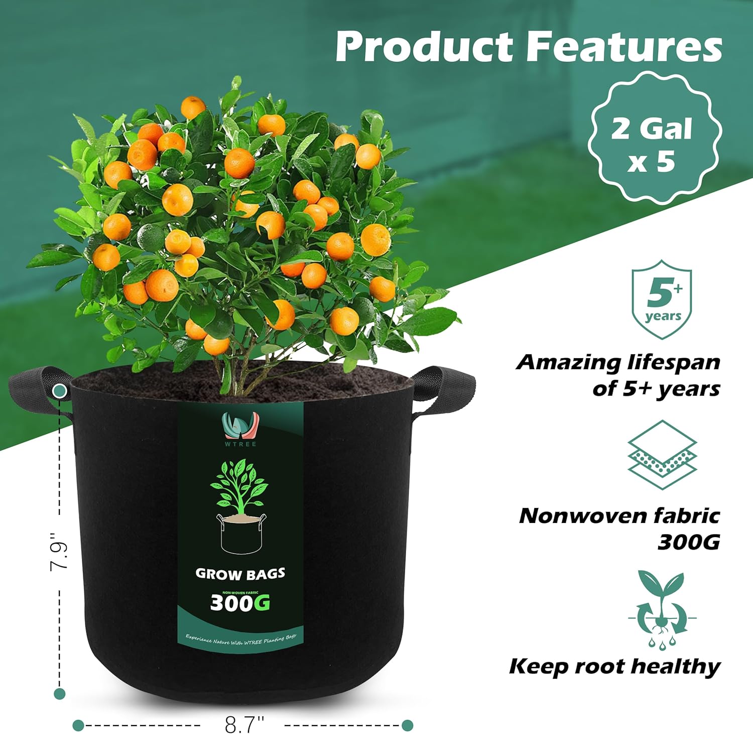 5-Pack 2 Gallons Grow Bags - Heavy Duty 300G Thickened Aeration Nonwoven Fabric Pots with Handles - Ideal Cloth Pots for Plants - Planters Accessories, Garden Vegetables Supplies