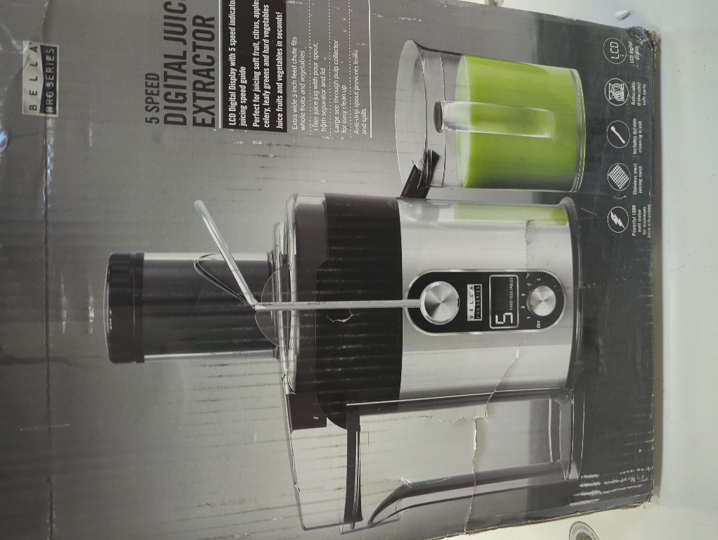 UNTESTED Itâs no secret that fruits and vegetables are a vital part of a healthy diet, so do yourself a favor and fuel up with the Bella 5 Speed Digital Juicer. Sporting a 1000-watt motor, and digital display, the juicerâs five speed control dial can be adjusted to process everything from soft fruits, citrus, apples, leafy greens and hard vegetables, delivering nutrient-rich beverages every time. Fast, durable, and easy to clean, the juicerâs feeding chute cuts down on prep time with its wide 3-inch opening that can process whole pieces of produce. Stainless steel mesh conquers even the toughest greens, delivering up to one liter of liquid at a time. Serve straight from the BPA-free juice jar equipped with a pour spout, a froth separator, and lid. Cleaning is key when dealing with fresh produce and the Bella Juicer easily dismantles with dishwasher-safe parts. Get on the health train and drink better with Bella Juicer.