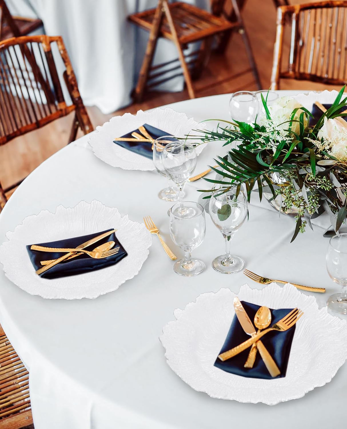 Premium Charger Plate: White chargers are made of premium plastic material, It is not only hard and firm, but also does not fade and has no odor.It is lightweight yet retains its texture, making it the best reusable choice.